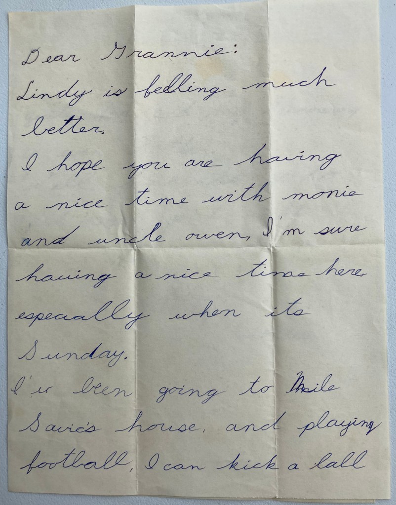 I hope you are having a nice time with Monie and uncle Owen, I’m sure having a nice time here especially when it’s Sunday. I’ve been going to Mike Savic’s house, and playing football, I can kick a ball quite far, and my throwing is even better.