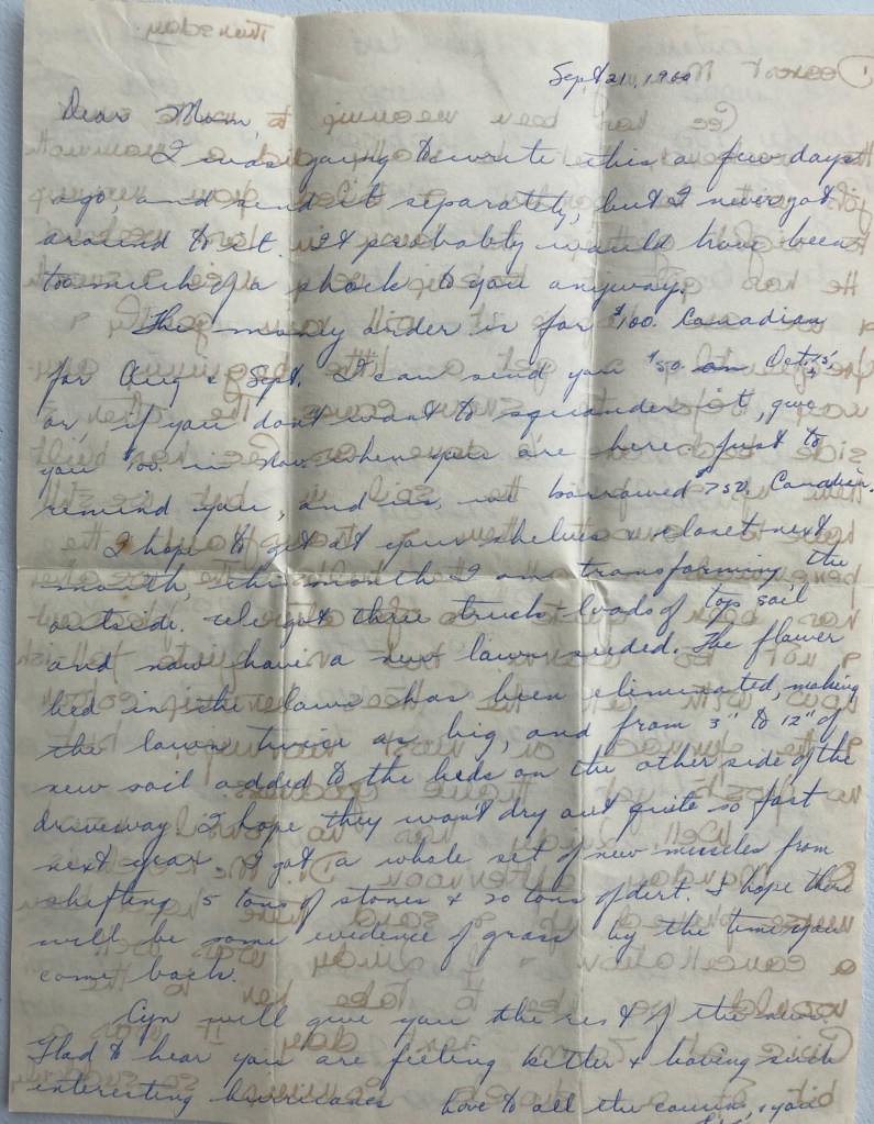 The money order is for $100.00 Canadian for Aug. & Sept. I can send you $50 Oct. 15, or if you don’t want to squander it, give you $100 in November when you are here. Just to remind you, and us, we borrowed $750.00 Canadian.
