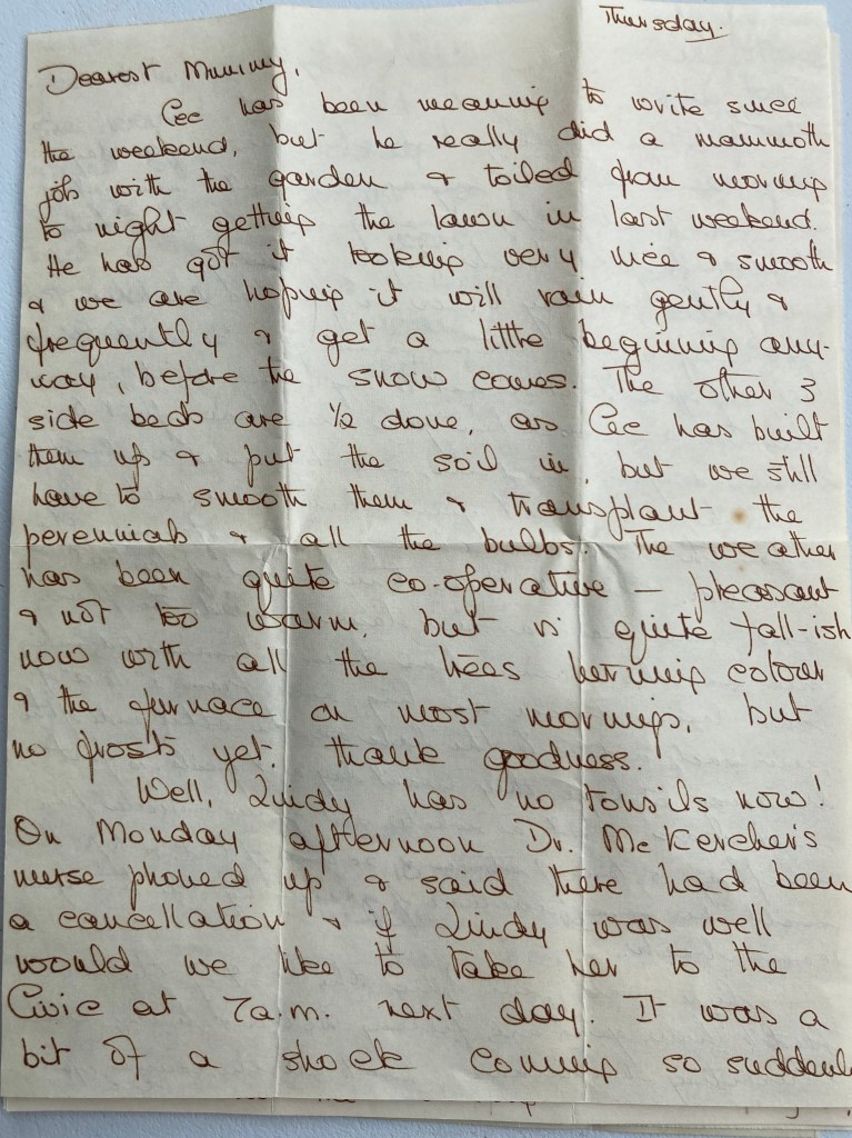 Well, Lindy has no tonsils now! On Monday afternoon Dr. McKercher’s nurse phoned up & said there had been a cancellation & if Lindy was well would we like to take her to the Civic at 7a.m. next day. It was a bit of a shock coming so suddenly poor little thing, but after the initial storm she was very good & didn’t seem too upset. On the Tuesday we all got up at 5:45a.m. (no b’fast for Lindy – we just had a drink) & were off at 6:30 & got her admitted. Then it turned out that she was to wait in the waiting room till a bed was ready, so I stayed with her & Cec & Charlie left. We waited there (L. had 2 new books) until 8:45 with other mothers & children & then she was put to bed & I left. I got home around 10 & had breakfast & her operation was at 11, so about 12 the doctor phoned & told me it was all over & that she was fine. He gave me all the instructions – 1 night in hospital – 2 in bed at home – 1 week in the house & 10 days away from school. Some children come out of hospital the same day, but with L. being done later they said they’d keep her over night & when Cec & I went to see her in the evening we were glad, as she was still very dopey and drowsy & would wake & look at us & then drop off to sleep again & not at all ready to be moved. Charlie stayed at the Savic’s, so had a good time. Next morning he went off to school & Cec & I went & got Lindy at 9:30 & brought her home. She was a bit wider awake, but was quite miserable all day, poor sweetie & not only was her throat sore, but the sides of her face & even has earache which Dr. McK. warned me she might have. He said to give her a 222, but you know she’d rather lie & suffer than take a pill! She slept in the afternoon & had a good night’s sleep & is a little happier today, although her throat is more swollen she says. She is drinking lots of liquids & has had some soup & bread & butter. I think it has been quite an emotional shock for her, you know – she is very quiet & subdued & of course finds it hard to talk. However, it is all over & will soon be feeling fine again – I am reading ‘Daddy-Long-Legs’ to her and she is enjoying that!