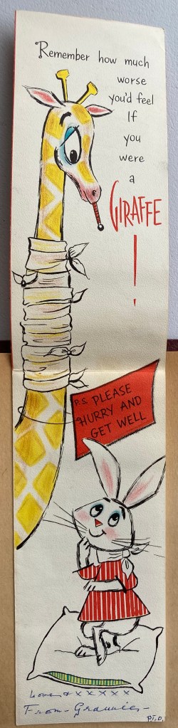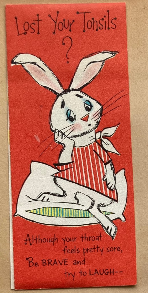 I have no memory of this time- although I have loved Jean Webster ever since- except for having joined the members of the family who had been in the hospital! Mummy had been in the hospital lots of times, Charlie had been in the hospital as a baby and 2 years before, and now Linda had had her tonsils out- but Daddy had never been in hospital- he had apparently had his tonsils removed as a child on the kitchen table in rural Saskatchewan!