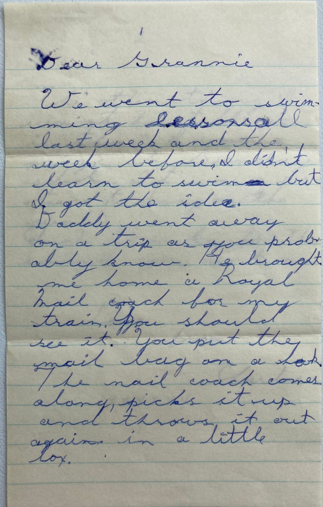 Daddy went away on a trip as you probably know. He brought me home a Royal Mail coach for my train. You should see it. You put the mail bag on a hook. The mail coach comes along, picks it up and throws it out again in a little box.