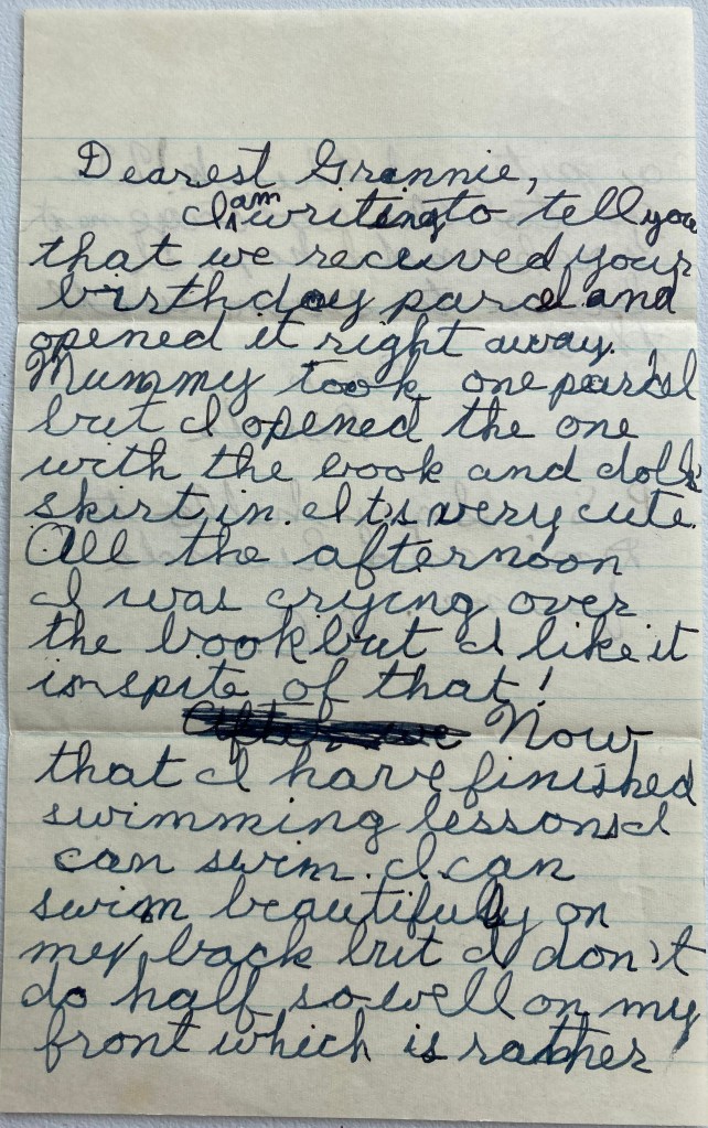 I am writing to tell you that we received your birthday parcel and opened it right away. Mummy took one parcel but I opened the one with the book and doll skirt in. It’s very cute. All the afternoon I was crying over the book but I like it in spite of that!
