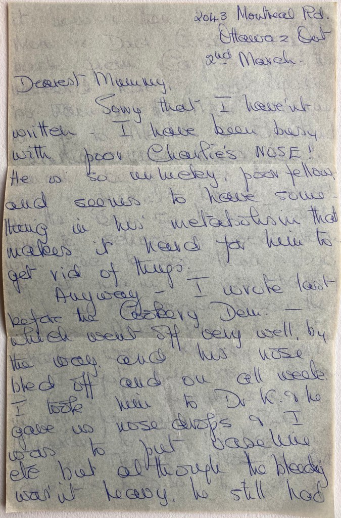 Anyway – I wrote last before the Cookery Dem. – which went off very well, by the way, and his nose bled off and on all week. I took him to Dr. K. & he gave us nose drops & I was to put vaseline etc. but although the bleeding wasn’t heavy, he still had it now & then. On the Friday Mom & Dad Costain came back from Carp & spent the weekend here & left again by train on Mon. morning to go to Merle’s at Brantford. Charlie’s nose had been much better over the weekend & didn’t bleed at all on the Sun. so Mon. I sent him to school & went down with Cec to see Mom & Dad off at 10 a.m. I was hardly back in the house before the School Nurse phoned that Charlie was bleeding again!