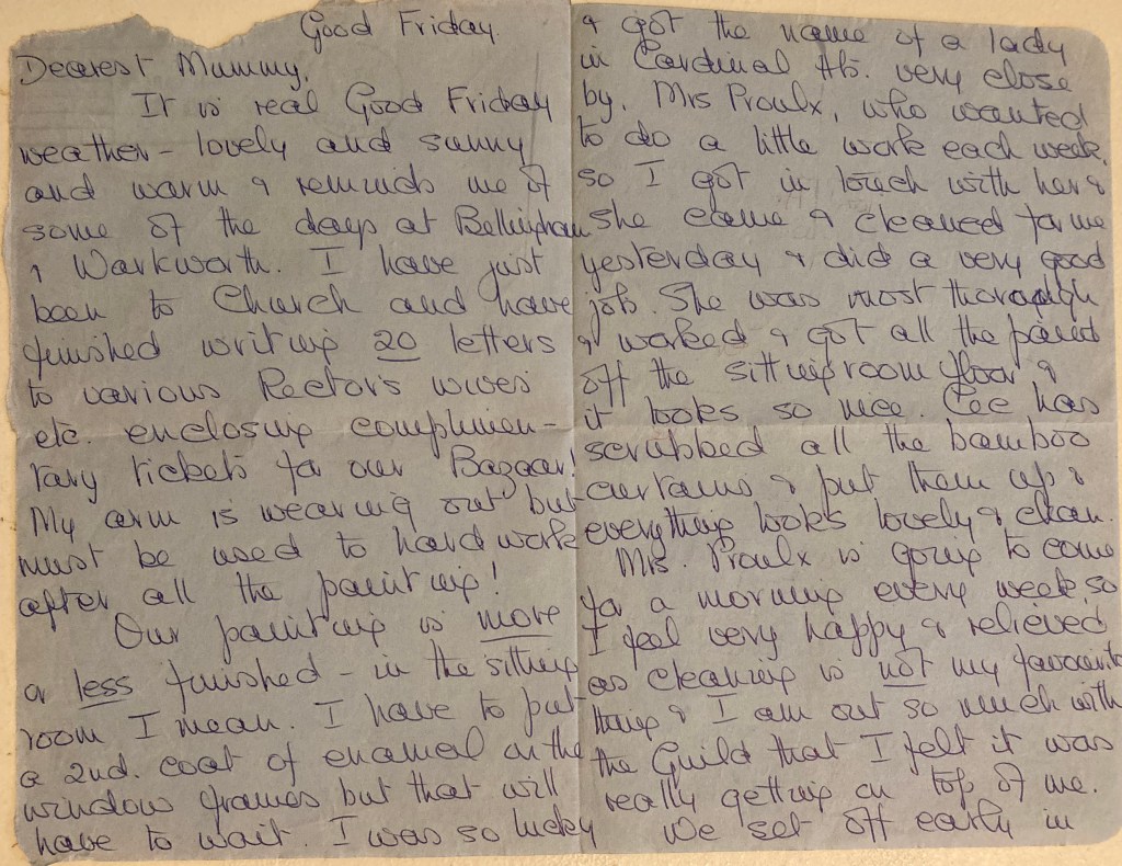It is real Good Friday weather – lovely and sunny and warm & reminds me of some of the days at Bellingham & Warkworth. I have just been to Church and have finished writing 20 letters to various Rector’s wives etc. enclosing complimentary tickets for our Bazaar! My arm is wearing out but it must be used to hard work after all the painting!