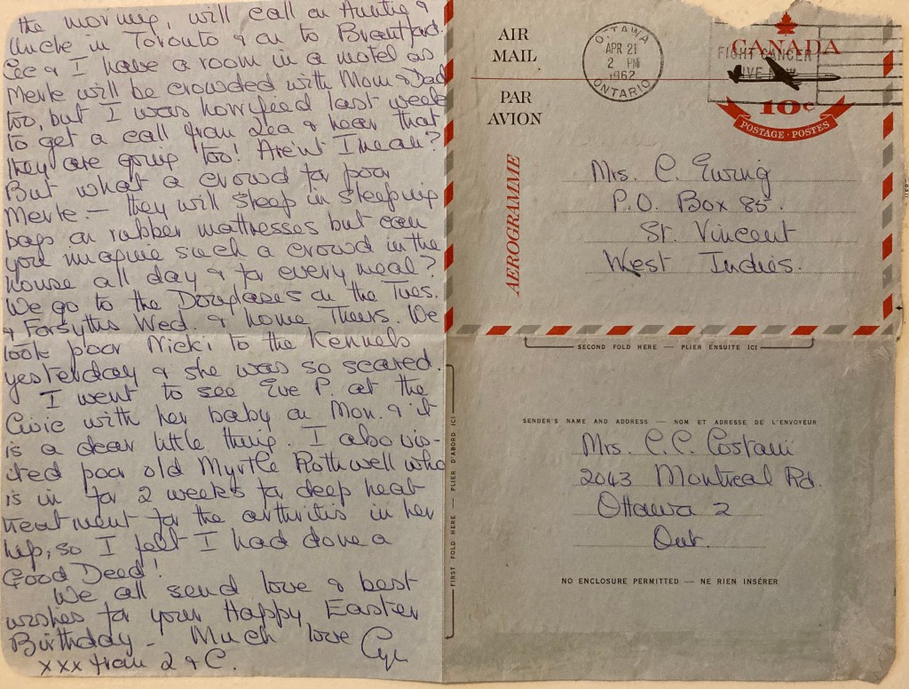 We set off early in the morning, will call on Auntie & Uncle in Toronto & onto Brantford. Cec & I have a room in a motel as Merle will be crowded with Mom & Dad too, but I was horrified last week to get a call from Lea & hear that they are going too! Aren’t I mean? But what a crowd for poor Merle – they will sleep in sleeping bags on rubber mattresses but can you imagine such a crowd in the house all day & for every meal? We go to the Douglasses on the Tues. & Forsyths Wed. & home Thurs. We took poor Nicki to the Kennels yesterday and she was so scared.
