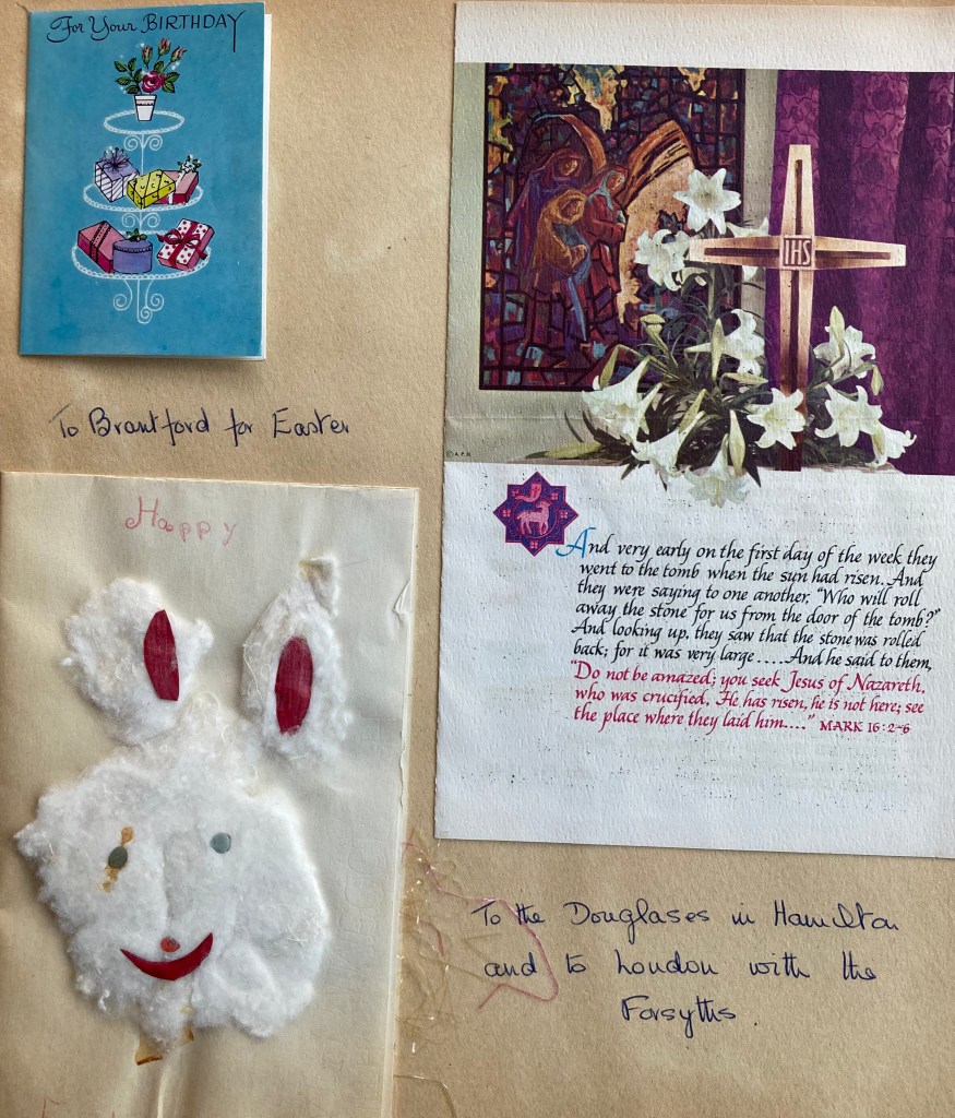The Costain grandparents had spent the winter in the East, where the grandchildren were all older than Carman and Leona’s toddlers, and so, after the successful family gathering in Ottawa at Cec and Cyn’s for Christmas, it was happening again at Easter at Merle’s in Brantford, where Granny and Grandpa Costain were now staying. Merle and Dix’s two older boys were away at university, but Linda and Charlie enjoyed visiting their cousin Bruce. Cyn and Cec were also intending to visit friends in southern Ontario while they were there. We have no letters telling about the Easter trip, but it was immortalized in the scrapbook!