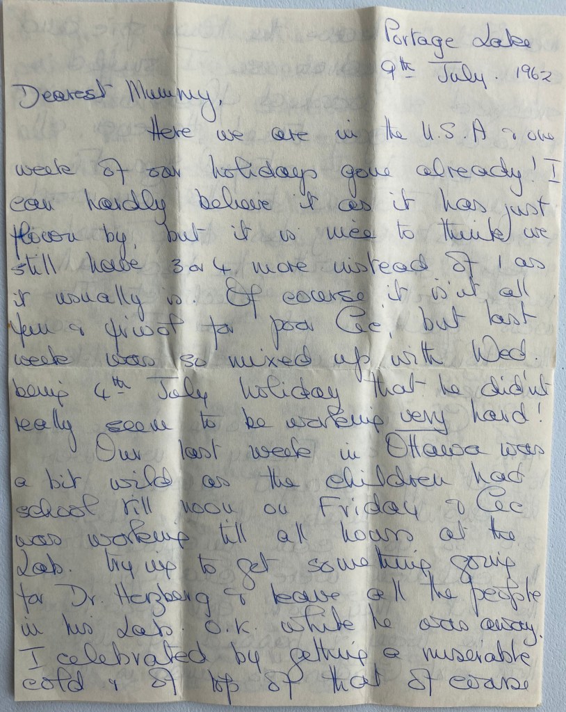 Our last week in Ottawa was a bit wild as the children had school till noon on Friday & Cec was working till all hours at the Lab. trying to get something going for Dr. Herzberg & leave all the people in his lab O.K. while he was away. I celebrated by getting a miserable cold & on top of that of course wanted to leave the house spic and span for Gudron, so I sniffled & sneezed & washed floors & waxed & had a gay time! However, all was left bee-oo-tiful & on Friday morning I went to the Coinwash & so got every last thing washed & left them with the beds all made with clean sheets etc. It was quite a job but I’m sure the house is really well spring cleaned this year!