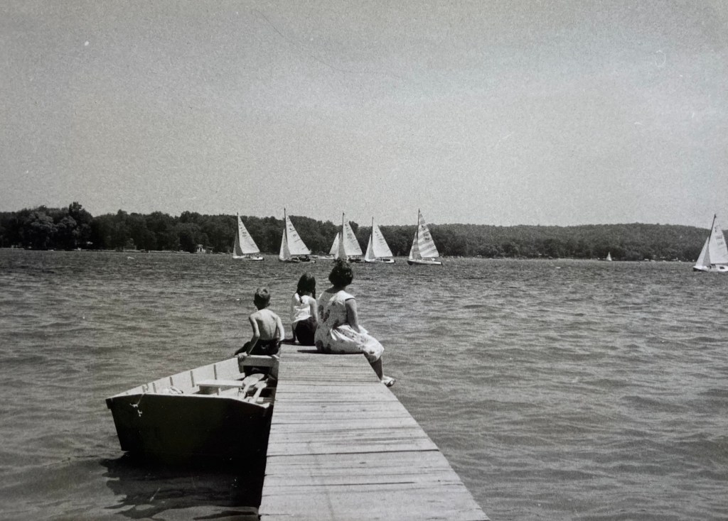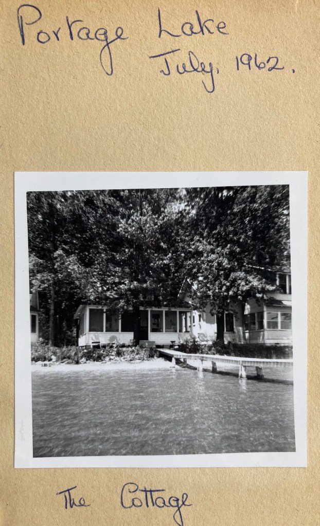 It is quite an ordinary cottage, but has 2 bedrooms, a nice kitchen with electric stove, sink (cold water) 2 refrig’s, bathroom & toilet etc. It is just a step to the lake & there is a little beach & a dock & rowboat – nice big trees for shade & a lovely big screened porch. The drawback- which isn’t so bad – is that the whole lake is lined with cottages side-by-side all the way around – 40’ or 50’ fronts. This close to Detroit these lots were opened up about 1900 & some of the houses & cottages are 40 or 50 years old. Actually, we have a very nice family called Madison from Detroit on one side with a little boy of 5, Danny, & on the other the people only come out for the day on Sundays it seems, so the neighbours are no handicap but at the weekend the lake is wild – sailboat races, speed boats, water skiers, swimmers all in together & we expect a massacre any minute! It is quiet during the week though & the water is lovely – sandy bottom & only up to my waist for about 100’ out & then deepens fairly quickly, but ideal for the children.