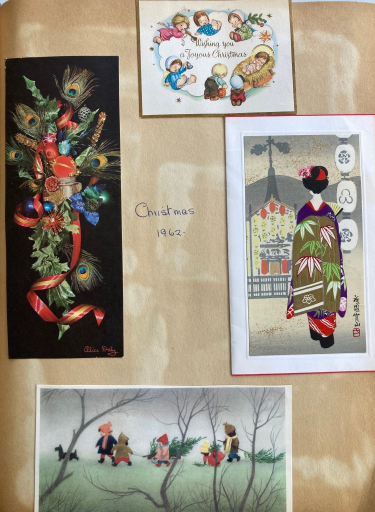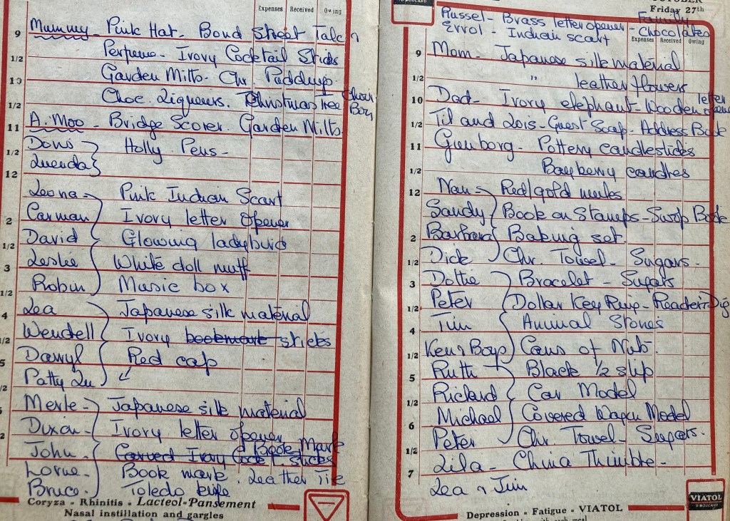 Cyn also had to get her Christmas parcels for friends and family overseas off as early as possible, and she needed to get ready for Charlie’s birthday and the Costain Christmas as well. Presents this year had been made easier by Cec’s travel- her ‘Presents Sent List’ shows that Cec’s sisters and mother all got ‘Japanese silk material’, with sisters-in-law Errol and Leona an ‘Indian Scarf’, while the men of the family got ivory trinkets, and nephew Bruce a ‘Toledo knife’.