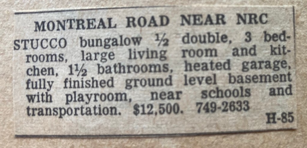 From January until March of 1963, the Costains were preparing to move to their new house, while leading their ordinary lives. Since the house was literally down the hill and around a corner, overseeing the renovations was not a hard job, but imagining living there was another matter. They would be living in a neighbourhood not on the highway, so it would be a different perspective, even though they already knew many families around. The school was closer, as the crow flies, but getting to it in a Canadian winter would have meant wading through snow over two untrodden fields, so the children left that idea until spring. Selling the Montreal Road duplex they lived in was an important part of the financing plan, so an ad was put in the newspaper. And packing began.