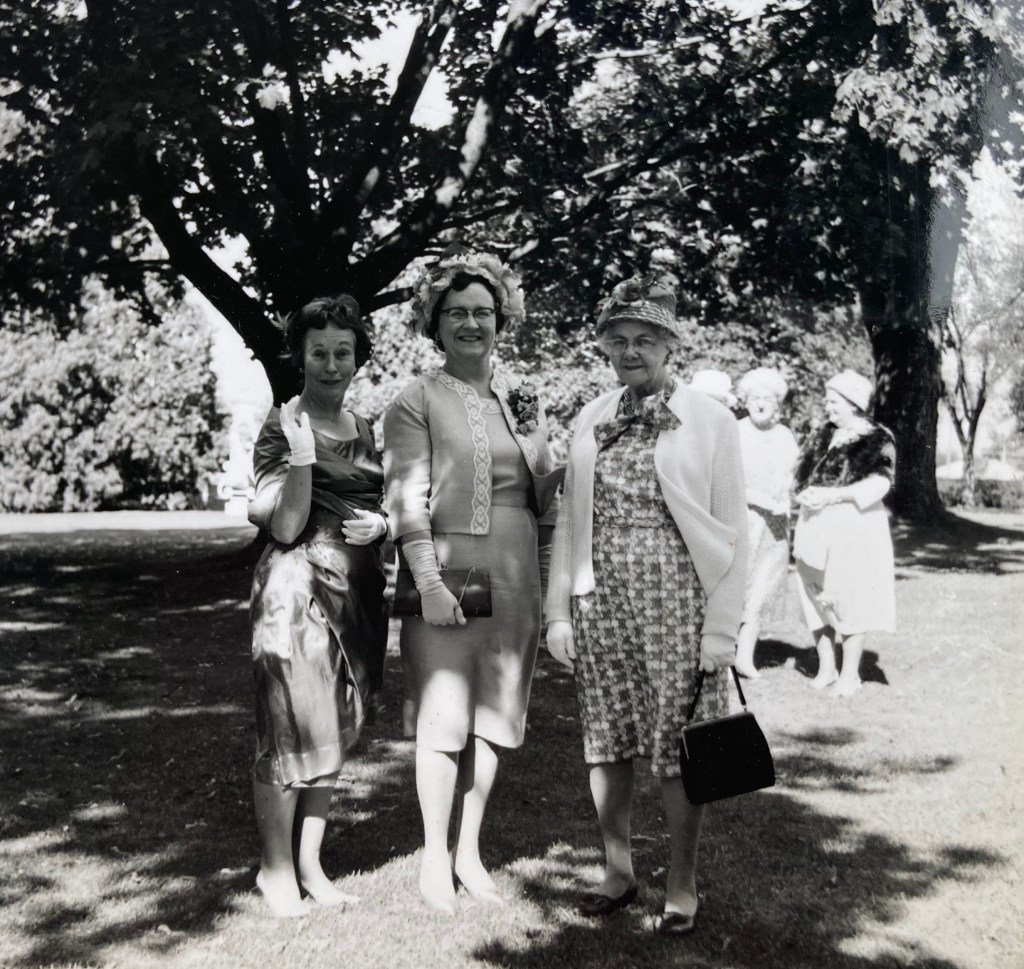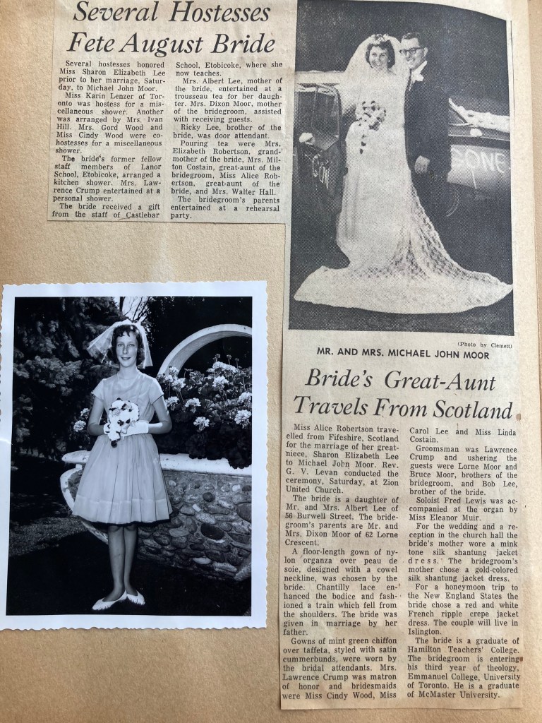 For the wedding, Cyn had made herself a dress out of a beautiful sari that the Kalras had been commissioned to buy years before in India. It was shot silk, a rich green in one light, brown in the other, with the ends embroidered with gold thread. Cyn took those ends for a wrap, and the dress from the middle yardage with the gold embroidery at the hem, and with it she wore a wonderful hat of long narrow iridescent blue and green feathers, close to the head. Merle, the mother of the groom, had a more commanding hat, pink petals outstanding, and Auntie Lily from Toronto represented the older generation. (John’s charge as a minister was ‘out West’ so the Costain grandparents, and uncles and families, could see the newlyweds once they had moved closer.) There were lots of Lees from the bride’s side, two red-headed younger brothers being groomsmen along with John’s two brothers, to escort the bride’s attendants. I was moderately pleased with my green dress, had white gloves and shoes (and nylon stockings) and a floaty headdress that blew about in the breeze. The bouquet was a surprise, being white carnations- with half of them dyed green- as if nature did not produce enough greenery for a bouquet! But I was thrilled wth a bridesmaids’ gift of a string of pearls to wear, and kept my opinion of the flowers to myself. The weather was lovely, the service went beautifully with all of us doing our parts properly, the pictures in one of Brantford’s riverside parks looked good afterwards and were relatively painless to take, and the reception was full of family and we all had fun. Then the Costains went off to Stratford and had a marvellous time.