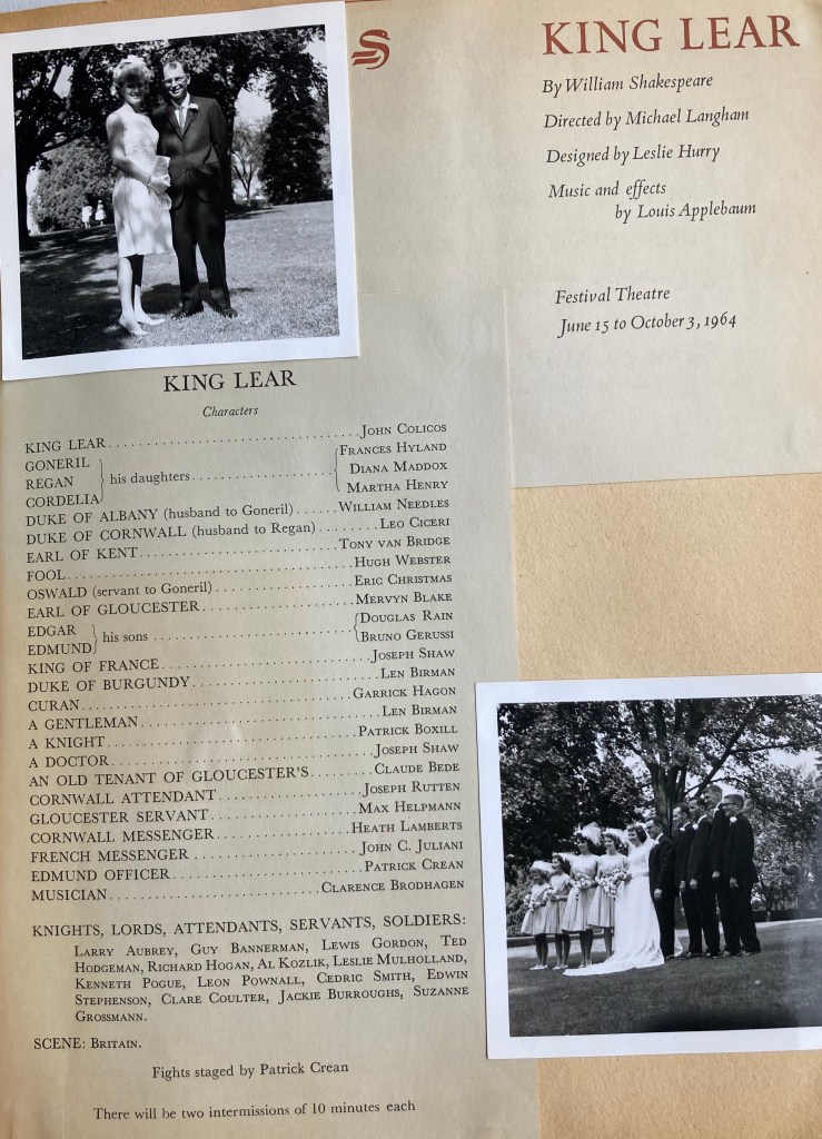 When we returned from camp we were upset to find that we had missed the beginning of visits from relatives gearing up for the pre-wedding excitement. It was always fun having people to stay and we were glad to be home. John had completed his theology degree and was ordained, Sharon had trained as a teacher, Lorne had already been teaching that year, as were his parents, and he and Liz had baby Debbie who was adorable. Charlie and I had swimming lessons again and then in August, we were off to Brantford for the wedding, to be combined with a trip to Stratford to see King Lear, The Marriage of Figaro, and Yeoman of the Guard.
