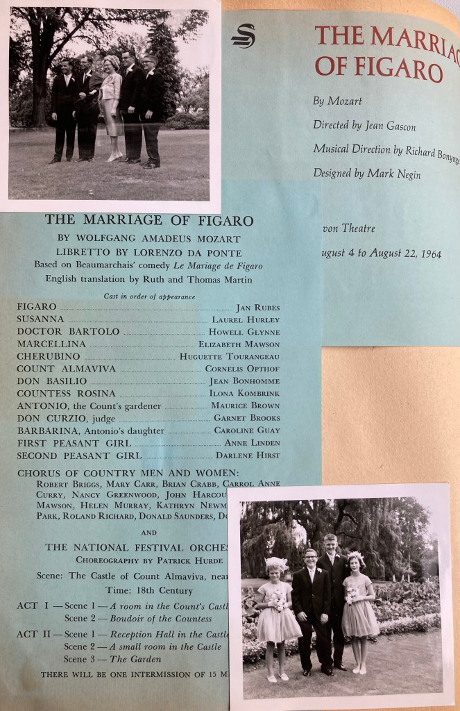 We had been going to Stratford since I was 8, and Cec and Cyn had always bought tickets off to the side of the thrust stage down in the first couple of rows, thinking that the children would be fascinated by the actors brushing by them to enter and exit even if the plot was beyond them. (It never was, what with the summary in the programme and the play in front of us.) So on this occasion, Gloucester’s eyes were gouged out realistically above and in front of us, and I bet I was not the only one hiding my eyes! The Gilbert and Sullivan productions were always marvellous, and The Marriage of Figaro has, from that summer on, always been my favourite opera. It was a happy time and a lovely holiday.