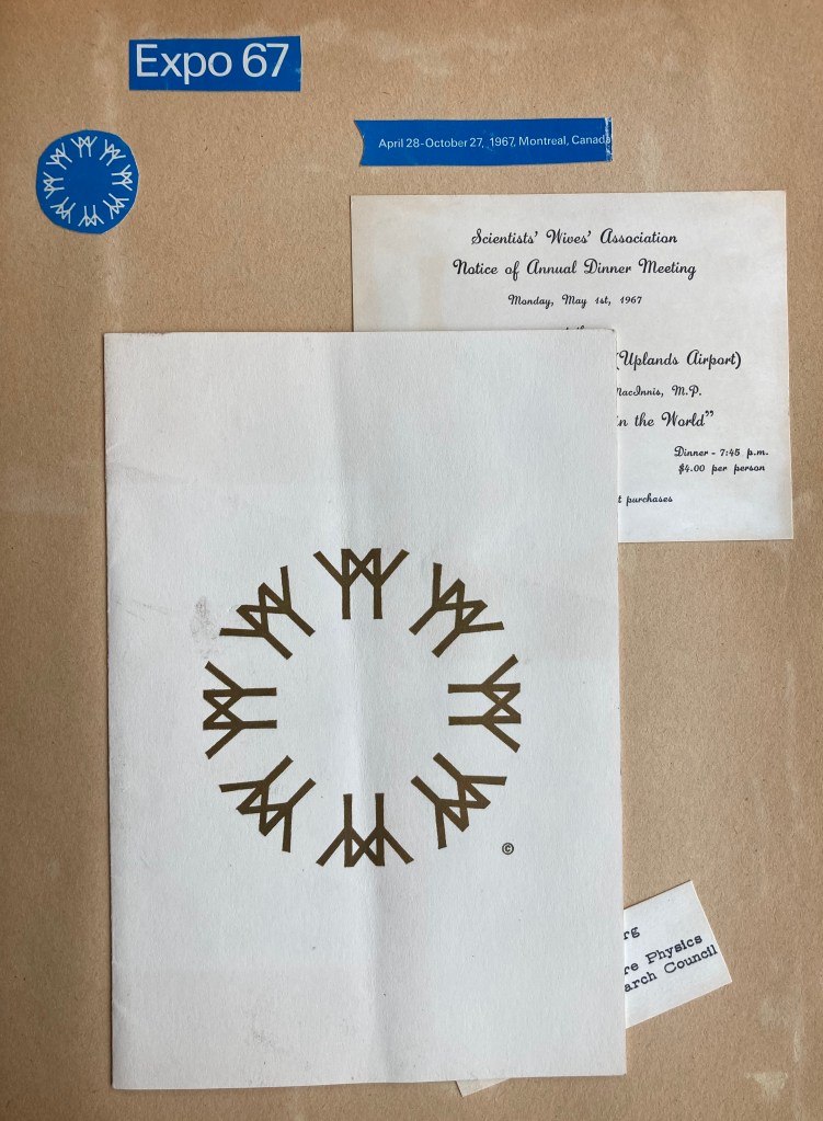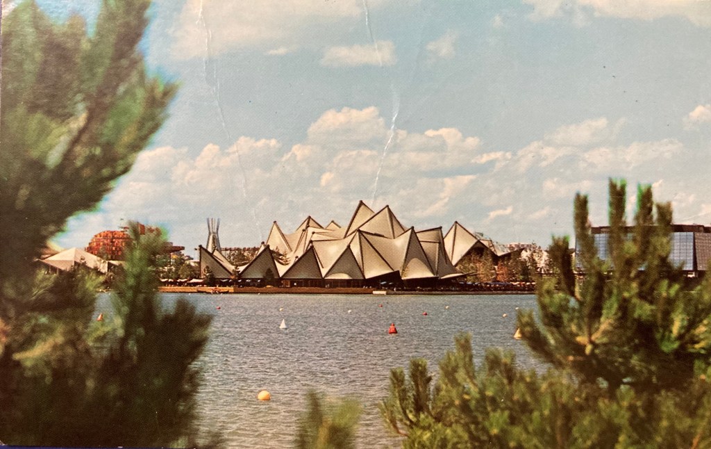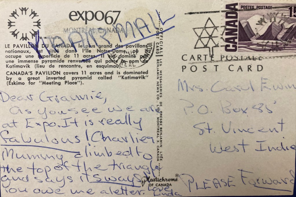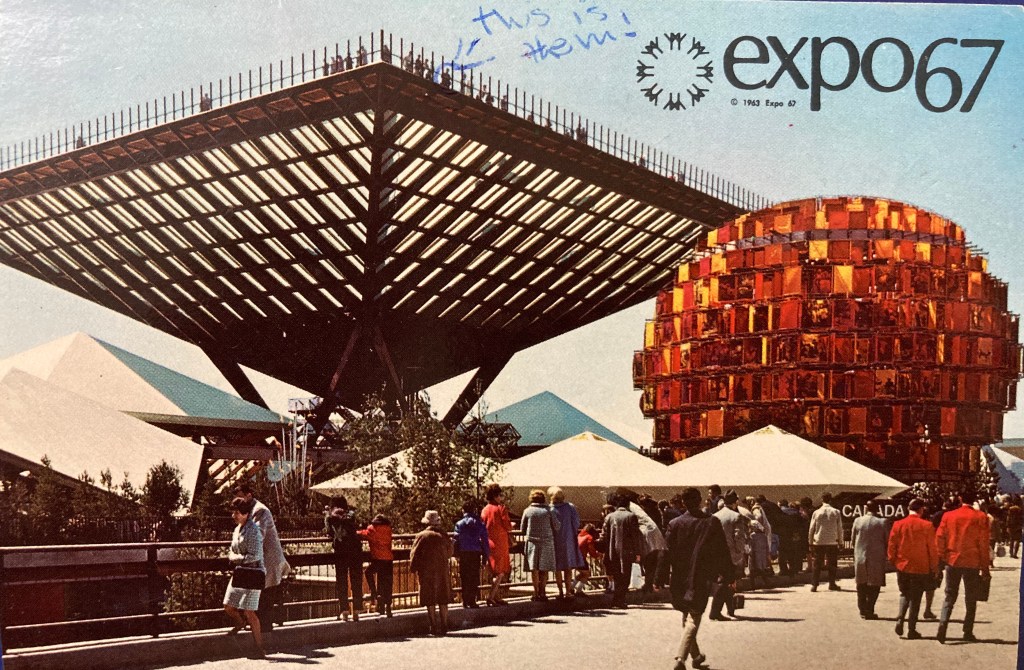 Now that I’ve read these letters, I know that Cyn must have remembered her visit to the New York World’s Fair in 1939 but I certainly don’t remember her making any comparisons at the time- I was too busy buying a real koala bear fur postcard- yes, repulsive, but very soft to stroke. I never sent that postcard, but Grannie saved a couple showing the Canadian Pavilion and the Ontario one. The front of the Expo 67 one has an arrow pointing to the minute people around the edge of the inverted pyramid and saying: This is them!
