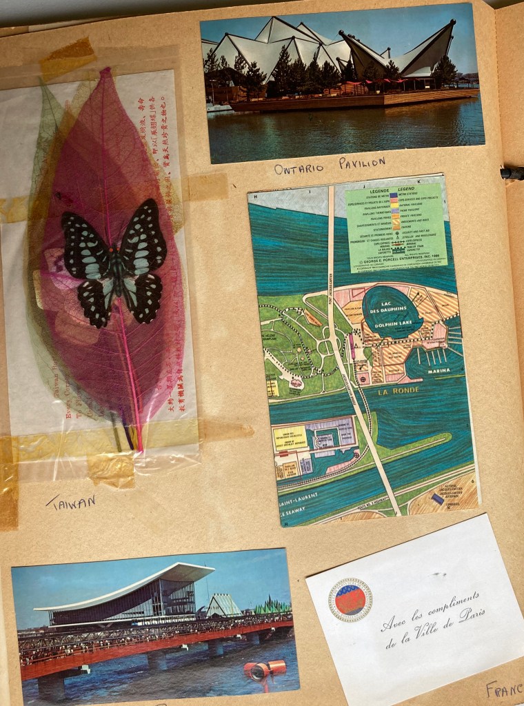 Cyn’s scrapbook shows the Ontario Pavilion, the most visited (but perhaps not by us, no swag) U.S.S.R. Pavilion at the bottom, and mementos from the France and Taiwanese pavilions, which we obviously went to.