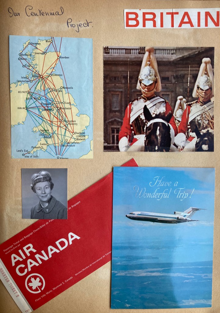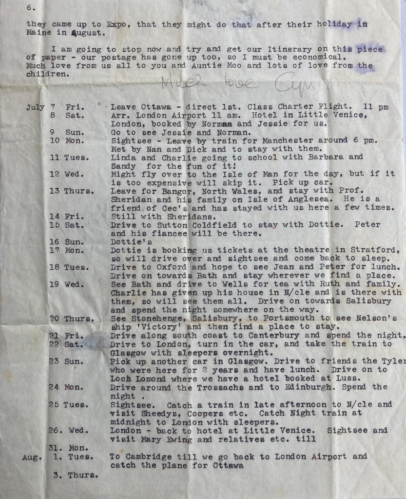 It is perhaps not surprising that Cyn’s Centennial Project, as an immigrant to Canada, was to return to England for the first time in eighteen years. Cec and Cyn had been planning this for years- but the demands of family, finances, and work had put off the trip. Cec had visited there and seen friends, as he passed through on work- related travels, and Cyn had kept in touch with letters, but the summer of 1967 was carefully organized to see as many friends, and as much of the U.K. as possible in a month. Cyn’s friend, Jessie Aldridge, who lived in London, helped set it up there.