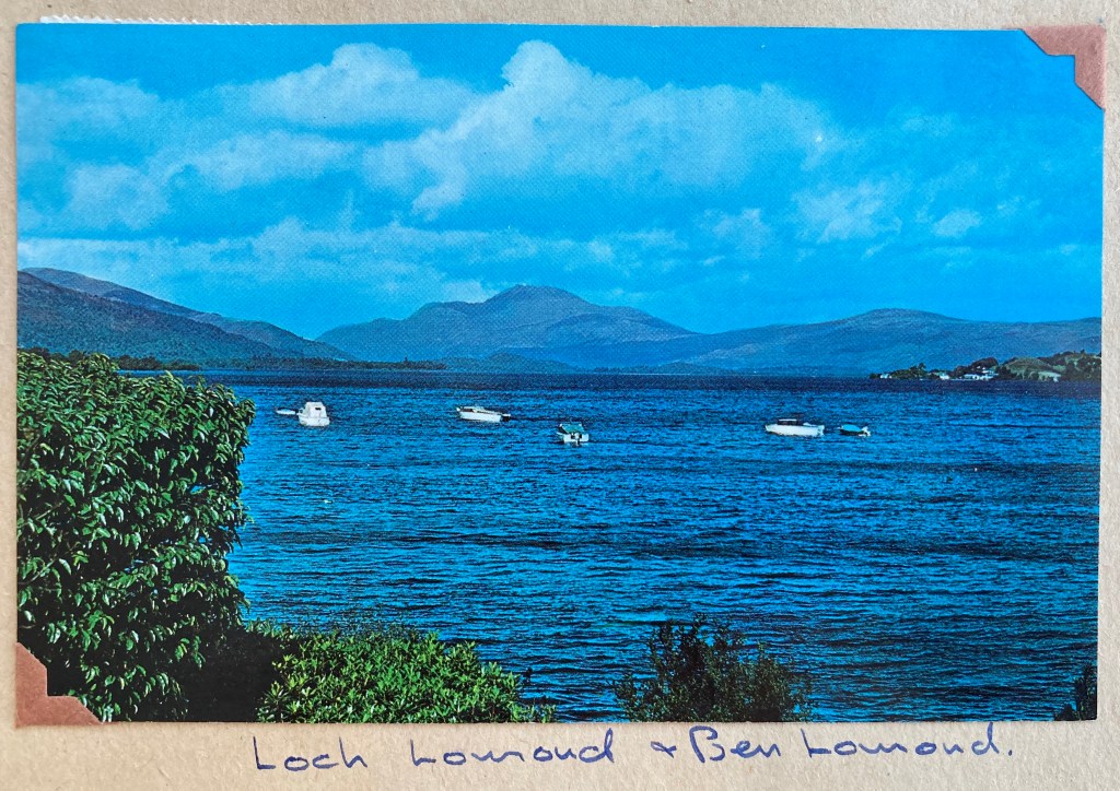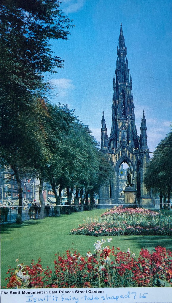 On Monday we went up through the Trossachs. I didn’t envy Sandy his Pennine Way walking tour, but I would love to tramp up there, I saw heather close, both kinds and I approve. We walked along Loch Katrine and threw pennies in to come back. We went on to Edinburgh. And the Firth of Fourth that I’ve so often read about. On the way we saw the Wallace Memorial on a hill against the sky and here in Edinburgh there is another of the same type to Scott. It embodies for me the statement in O. Douglas’s ‘The Setons’ — “We have all of us, we Scots, a queer daftness in our blood. We pretend to be dour and cautious, but the fact is that at heart we are the most emotional and sentimental people on earth.” I am getting horribly sentimental myself, I hope you like it. Paper lures me on sometimes. I find we have no picture of either memorial- Bother ! – Yes I do, I found one. Will stick it in. LC