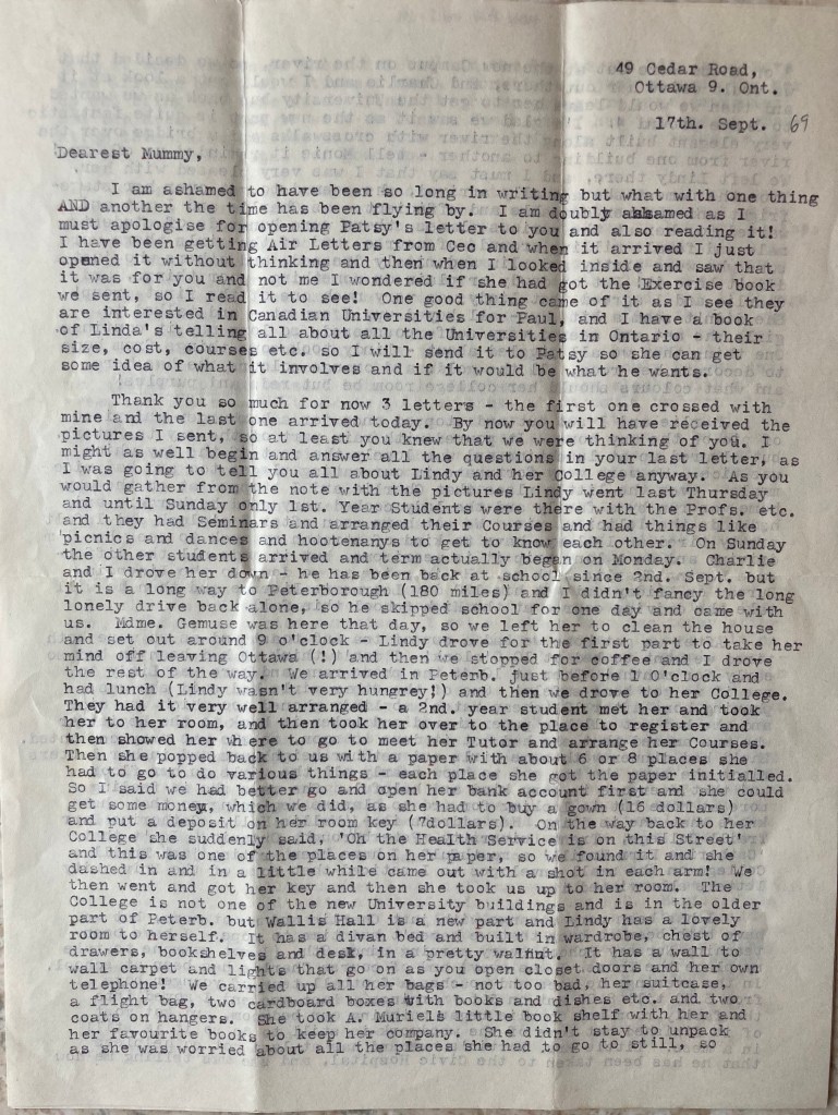 Thank you so much for now 3 letters – the first one crossed with mine and the last one arrived today. By now you will have received the pictures I sent, so at least you knew that we were thinking of you. I might as well begin and answer all the questions in your last letter, as I was going to tell you all about Lindy and her College anyway. As you would gather from the note with the pictures Lindy went last Thursday and until Sunday only 1st Year Students were there with the Profs. etc. and they had Seminars and arranged their Courses and had things like picnics and dances and hootenanys to get to know each other. On Sunday the other students arrived and term actually began on Monday. Charlie and I drove her down – he has been back at school since 2nd Sept. but it is a long way to Peterborough (180 miles) and I didn’t fancy the long lonely drive back alone, so he skipped school for one day and came with us. Mme Gemuse was here that day, so we left her to clean the house and set out around 9 o’clock – Linda drove for the first part to take her mind off leaving Ottawa (!) and then we stopped for coffee and I drove the rest of the way. We arrived in Peterborough just before 1 o’clock and had lunch (Lindy wasn’t very hungry!) and then we drove to her College. They had it all very well arranged – a 2nd year student met her and took her to her room, and then took her over to the place to register and then showed her where to go to meet her tutor and arrange her courses. Then she popped back to us with a paper with about 6 or 8 places she had to go to do various things – each place she got the paper initialed. So I said we had better go and open her bank account first and she could get some money, which we did, as she had to buy a gown (16 dollars) and put a deposit on her room key (7 dollars). On the way back to her College she suddenly said, “Oh, the Health Service is on this Street” and this was one of the places on her paper, so we found it and she dashed in and in a little while came out with a shot in each arm! We then went and got her key and then she took us up to her room. The college is not one of the university buildings and is in the older part of Peterborough but Wallis Hall is a new part and Lindy has a lovely room to herself. It has a divan bed and built in wardrobe, chest of drawers, bookshelves and desk, in a pretty walnut. It has a wall to wall carpet and lights that go on as you open closet doors and her own telephone! We carried up all her bags – not too bad, her suitcase, a flight bag, two cardboard boxes with books and dishes etc. and two coats on hangers. She took A. Muriel’s little bookshelf with her and her favourite books to keep her company. She didn’t stay to unpack as she was worried about all the places she had to go to still, so 2 of these were out at the new campus on the river, so we decided that we would drive her out there, and Charlie and I would get a look at it and then we would leave her to get the university bus back as we wanted to leave around four. I’m glad we saw it as the new part is quite fantastic very elegant built along the river with crosswalks and a bridge over the river from one building to another – tell Monie it reminded us of Expo! We left Linda there, and I must say that I was very pleased with her. From the moment she actually arrived she seemed to get over her stage fright and was very capable and efficient – as Charlie and I sat and waited for her at the various places, there were hundreds of students, male and female milling around, of course, and all of the girls there were some who were pretty and slim and nicely dressed, and others who just didn’t have it! Fat or dowdy or plain or something, poor things, and Charlie and I agreed that Lindy was very much one of the first group! She didn’t seem a bit shy – all keyed up I expect – and talked to girls she met and seemed very self-possessed, so long may it continue. One thing that we all giggled about – Lindy took some things from home to decorate her room, all the gold and orange colours she has here, and what colour should her college room be but reds and purples!