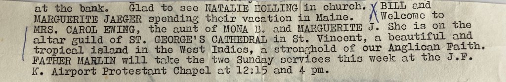 ‘BILL and MARGUERITE JAEGER spending their vacation in Maine. Welcome to MRS. CAROL EWING, the aunt of MONA B. and MARGUERITE J. She is on the Altar Guild of ST. GEORGE’S CATHEDRAL in Saint Vincent, a beautiful and tropical island in the West Indies, a strong hold of our Anglican faith. FATHER MARLIN will take the two Sunday services this week at the J.F.K. Airport Protestant Chapel at 12:15 and 4 pm.’