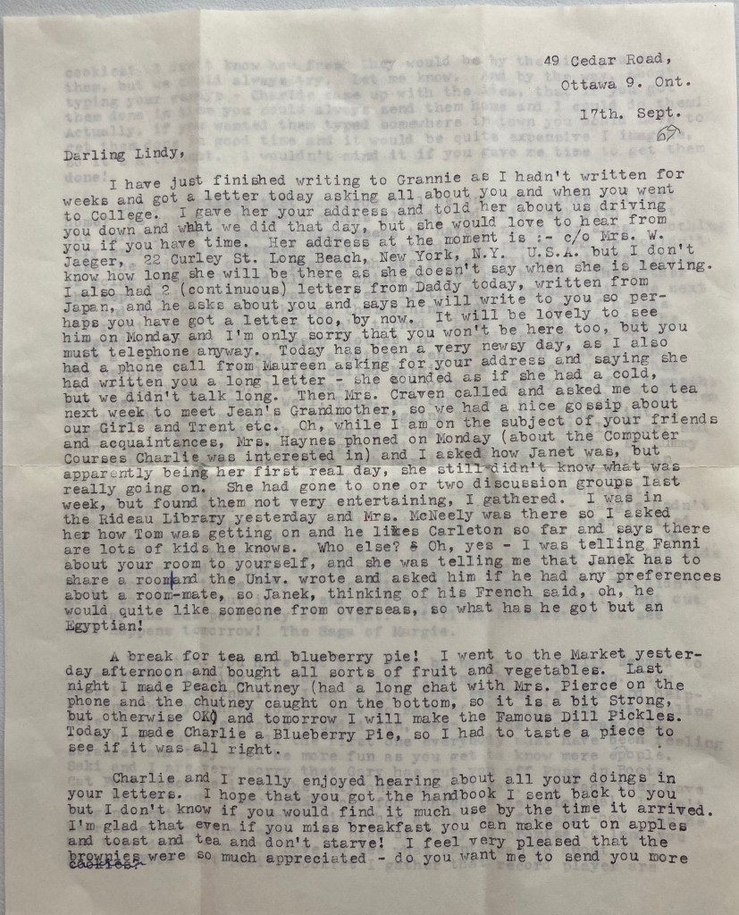 I have just finished writing to Grannie as I haven’t written for weeks and got a letter today asking all about you and when you went to College. I gave her your address and told her about us driving you down and what we did that day, but she would love to hear from you if you have time. Her address at the moment is: – c/o Mrs. W. Jaeger, 22 Curley St.. Long Beach, New York, N.Y. U.S.A. but I don’t know how long she will be there as she doesn’t say when she is leaving. I also had 2 (continuous) letters from Daddy today, written from Japan, and he asks about you and says he will write to you so perhaps you have got a letter too, by now. It will be lovely to see him on Monday and I’m only sorry that you won’t be here too, but you must telephone anyway. Today has been a very newsy day, as I also had a phone call from Maureen asking for your address and saying she had written you a long letter – she sounded as if she had a cold, but we didn’t talk long. Then Mrs. Craven called and asked me to tea next week to meet Jean’s Grandmother, so we had a nice gossip about our Girls and Trent etc. Oh, while I am on the subject of your friends and acquaintances, Mrs Haynes phoned on Monday (about the computer course Charlie was interested in) and I asked how Janet was, but apparently being her first real day, she still didn’t know what was really going on. She had gone to one or two discussion groups last week, but found them not very entertaining, I gathered. I was in the Rideau Library yesterday and Mrs. McNeely was there so I asked her how Tom was getting on and he likes Carleton so far and says there are lots of kids he knows. Who else? Oh, yes – I was telling Fanni about your room to yourself, and she was telling me that Janek had to share a room and the Univ. wrote and asked him if he had any preferences about a room-mate, so Janek, thinking of his French said, oh, he would quite like someone from overseas, so what has he got but an Egyptian!