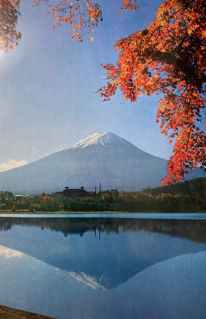 My hotel is just outside the moat of the Imperial Palace, and on the grounds opposite is a Buda – kan, -sports gym for judo events etc. Looking out of the window I could see the roof outlined against the sky, and realized what I must have heard and known – that the traditional roof of Japanese architecture and pagodas, is in the exact line of Mount Fuji.