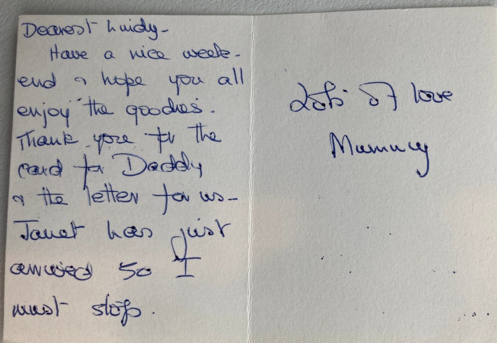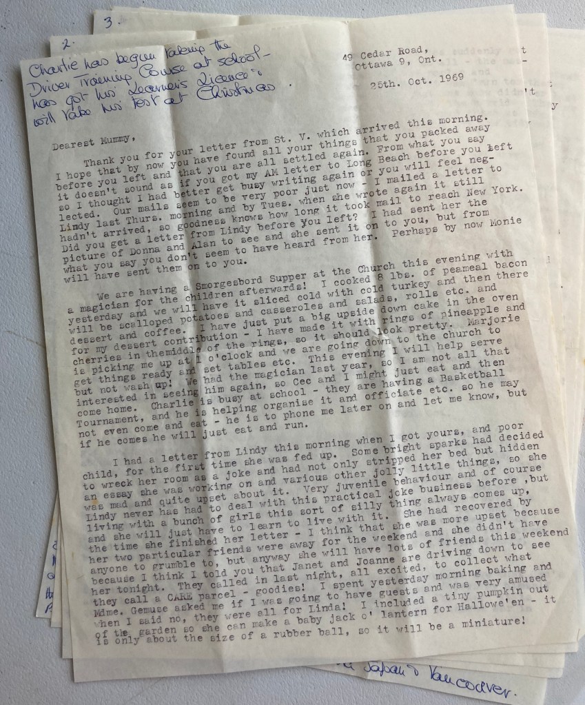 I had a letter from Lindy this morning when I got yours, and poor child, for the first time she was fed up. Some bright sparks had decided to wreck her room as a joke and had not only stripped her bed but hidden an essay she was working on and various other jolly little things, so she was mad and quite upset about it. Very juvenile behaviour and of course Lindy never has had to deal with this practical joke business before, but living with a bunch of girls this sort of silly thing always comes up, and she will just have to learn to live with it. She had recovered by the time she finished her letter – I think that she was more upset because her two particular friends were away for the weekend and she didn’t have anyone to grumble to, but anyway she will have lots of friends this weekend because I think I told you that Janet and Joanne are driving down to see her tonight. They called in last night, all excited, to collect what they call a CARE parcel – goodies!
