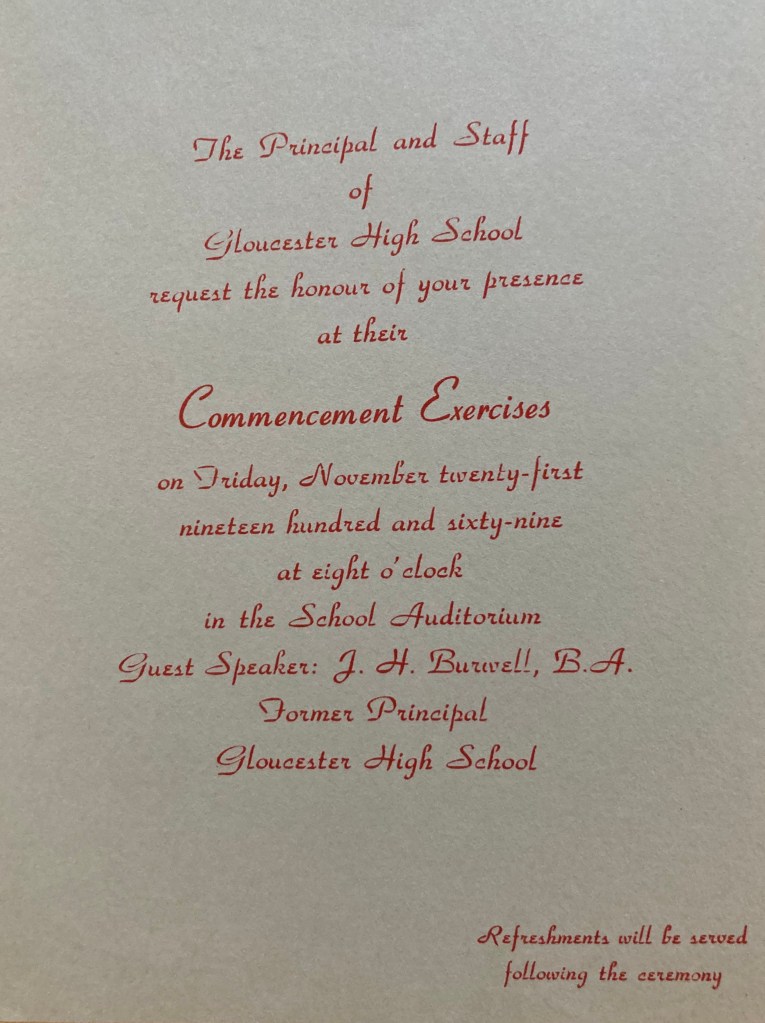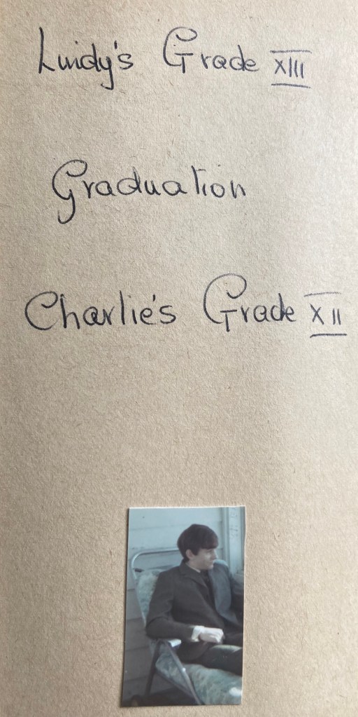 Of course, Lindy was another problem. Neither she nor any of her friends had any hope of any of the boys in their class asking them to the dance, and it seemed such a pity to me that she should miss this big occasion at the end of her school career. So in the summer I suggested to her that we invite Bruce up for the Graduation weekend and that he should take her to the dance. At first she was quite horrified that Bruce [her first cousin, a year older than she] would be forced into taking her, but I said that he has always enjoyed coming out to visit us and he has no steady girlfriend so it wouldn’t be any harm in asking him, so she said all right I could perhaps mention it to Merle and see what she thought. Well, Merle thought Bruce would like to come, but she sounded him out and he was delighted, so wasn’t that nice? Lindy is going down to Brantford this weekend to see them and will get things organized I expect, as her Commencement invitation just came last week and I forwarded it on to her. When she was home at Thanksgiving we talked about clothes and of course she will have to have a long dress over which she was very excited! We have the beautiful pale blue and silver sari to make her an evening dress someday, but we both agreed that we would save it for another occasion and buy material for this one. What I did suggest though, was that I should make her a short dress out of the rest of my green and gold sari for the actual graduation ceremony. The Principal wants the girls to wear short dresses as this doesn’t make it awkward for girls who can’t afford long dresses, so I have quite a bit of the green sari left and a long piece which was a kind of stole on my dress and so we got a pattern for quite a plain little sleeveless dress with a little stand up collar, and I have been piecing and fitting and I think I can get it out all right. The sari has a pretty green and blue pattern at the end, and then a narrow gold edge along the sides, and I think I can get the pattern all around the hem and then a little of the gold on the collar. We will have to choose material and a pattern for a long dress when she is home next week, so you can see I am going to be busy! Isn’t it fortunate that I can sew – think how much money I would be spending on my daughter’s finery if I couldn’t! I meant to tell you that Charlie asked his friend Chrystal to the dance, but her father wouldn’t let her go, so he has asked a girl in his class at school called Maureen MacQuarrie – she lives over at Blackburn Hamlet and is one of the ‘crowd’ which has been going around together for most of the year so that is rather nice. She is a little dark-haired girl and has been in Charlie’s class since about Gr. 2 and I know her mother as she is a worker for the United Church, so I hope they all have a good time.