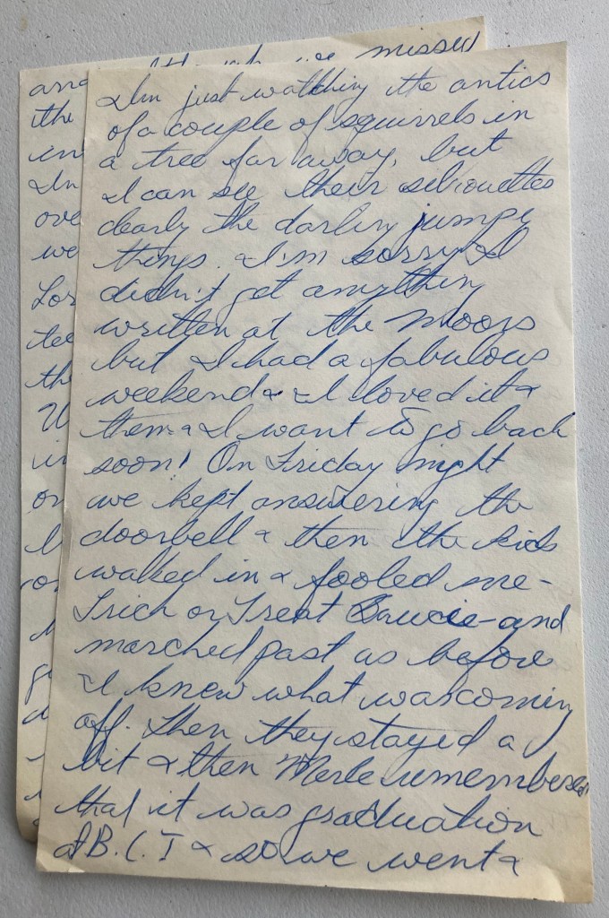 … I’m just watching the antics of a couple of squirrels in a tree far away, but I can see their silhouettes clearly the darling jumpy things. I’m sorry I didn’t get anything written at the Moors but I had a fabulous weekend & I loved it & them & I want to go back soon! On Friday night [Hallowe’en] we kept answering the doorbell & then the kids [Bruce’s small nieces, Debbie and Cyndie] walked in & fooled me – Trick or Treat Brucie – and marched past us before I knew what was coming off. Then they stayed a bit & then Merle remembered that it was graduation at B.C.I. & so we went & I felt awfully out of place among the formals, but Bruce showed me around the high school & it was quite fun. The next morning we went into Hamilton because Bruce had to move to another room so I helped him & then he showed me around Mac [McMaster university, Bruce was in second year.] & it was raining. Then we came back & did nothing & worked. The Lornes came to dinner & it was funny especially Cyndie & her food. After they left me & Bruce went on working, but Sophocles bored me & his math prob. wouldn’t come out so we gave up & made popcorn & watched T.V. Well, on Sunday I went to a Baptist church, and although we missed the first bit, it was very interesting, and a change. In the afternoon we went over to Lorne’s & Liz & Cyndie went to Glenhurst, but Lorne made me & Debbie tea, and he & Bruce played the piano. After dinner, Uncle Dix & Bruce drove me into Toronto and put me on the bus & went, Bruce was being dropped off in Hamilton on the way back. Bruce had his Mac jacket on & the girl I sat with thought he was my boyfriend & told me all about Homecoming weekend (which she had gone to with her boyfriend). She chatted on for a bit & then tried to sleep, but I had my light on & there was a baby which cried all the time, so she didn’t succeed. Then I shared a taxi with another girl & got here, was greeted exuberantly, fell into bed & slept till noon today. I’m phoning you tonight & will be home soon Love Linda