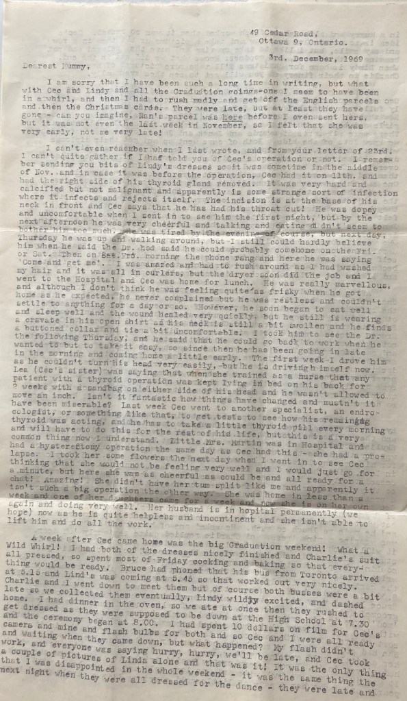 I can’t even remember, when I last wrote, and from your letter of the 23rd, I can’t quite gather if I had told you of Cec’s operation or not. I remember sending you bits of Linda’s dresses, so it was sometime in the middle of Nov. and in case it was before the operation, Cec had it on the 11th, and had the right side of his thyroid gland removed. It was very hard and calcified, but not malignant, and apparently is some strange sort of infection where it infects and rejects itself. The incision is at the base of his neck in front and Cec says that he has had his throat cut! He was dopey and uncomfortable when I went in to see him the first night, but by the next afternoon, he was very cheerful and talking and eating didn’t seem to bother him too much. He was tired by the evening, of course, but next day, Thursday, he was up and walking around, but I still could hardly believe him when he said, the Dr. had said he could probably come home on the Fri. or Sat. Then on Fri. morning the phone rang and here he was saying ‘Come and get me’. I was amazed, and had to rush around as I had washed my hair, and it was all in curlers, but the dryer soon did the job and I went to the Hospital, and Cec was home for lunch. He was really marvellous, and, although I don’t think he was feeling quite as frisky when he got home as he expected, he never complained but he was restless and couldn’t settle to anything for a day or so. However, he soon began to eat well and sleep well, and the wound healed very quickly, but he still is wearing a cravat in his open shirt as his neck is still a bit swollen, and he finds a buttoned collar and tie a bit uncomfortable. I took him to see the Dr the following Thursday, and he said that he could go back to work when he wanted to but to take it easy, so that since then he has been going in late in the morning, and coming home a little early. The first week I drove him as he couldn’t turn his head very easily, but he is driving himself now. Lea (Cec’s sister) was saying that when she trained as a nurse that any patient with a thyroid operation was kept lying in bed on his back for 2 weeks with a sandbag on either side of his head and he wasn’t allowed to move an inch. Isn’t it fantastic how things have changed and mustn’t it have been miserable? Last week Cec went to another specialist, an endocrinologist or something like that, to get a test to see how his remaining thyroid was acting, and he has to take a little thyroid pill every morning, and will have to do this for the rest of his life, but this is a very common thing now I understand. Little Mrs. Martin was in the Hospital and had a hysterectomy operation the same day as Cec had his – she had a prolapse. I took her some flowers the next day when I went in to see Cec thinking that she would not be feeling very well, and I would just go for a minute, but here she was as cheerful as could be, and all ready for a chat! Amazing! She didn’t have her tum split like me and apparently it isn’t such a big operation the other way. She was home in less than a week and one of her daughters came for a week and now she is on her own again and doing very well. Her husband is in the hospital permanently (we hope) now as he is quite helpless and incontinent and she isn’t able to lift him and do all the work.