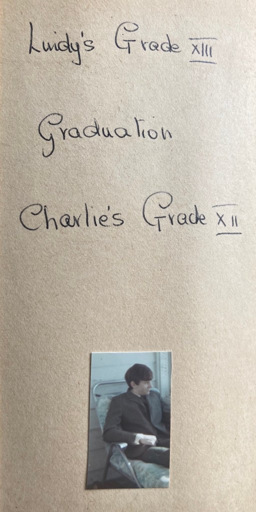 The week after Cec came home with the big Graduation weekend! What a Wild Whirl! I had both of the dresses nicely finished, and Charlie’s suit all pressed, so I spent most of Friday cooking and baking so that everything would be ready. Bruce had phoned that his bus from Toronto arrived at 5:15 and Lindy’s was coming at 5:45 so that worked out very nicely. Charlie and I went down to meet them but of course both buses were a bit late so we collected them eventually, Lindy wildly excited, and dashed home. I had dinner in the oven, so we ate at once then they rushed to get dressed as they were supposed to be down at the High School at 7:30 and the ceremony began at 8:00. I had spent $10 on film for Cec’s camera and mine and flash bulbs for both and so Cec and I were already and waiting when they came down, but what happened? My flash didn’t work, and everyone was saying hurry, hurry, we’ll be late, and Cec took a couple of pictures of Linda alone, and that was it! It was the only thing that I was disappointed in the whole weekend – it was the same thing the next night when they were all dressed for the dance – they were late and in a hurry, and although my flash worked then it was so rushed. Cec’s idea is to stand them in a row and take a picture or sit them in a row and say smile, but I like to take my time and have them relax and not beaming at the camera, but goodness knows what we did get in the end. When Linda is home for Christmas I’ll take more pictures of her and Charlie and their finery so you will get to see them eventually.