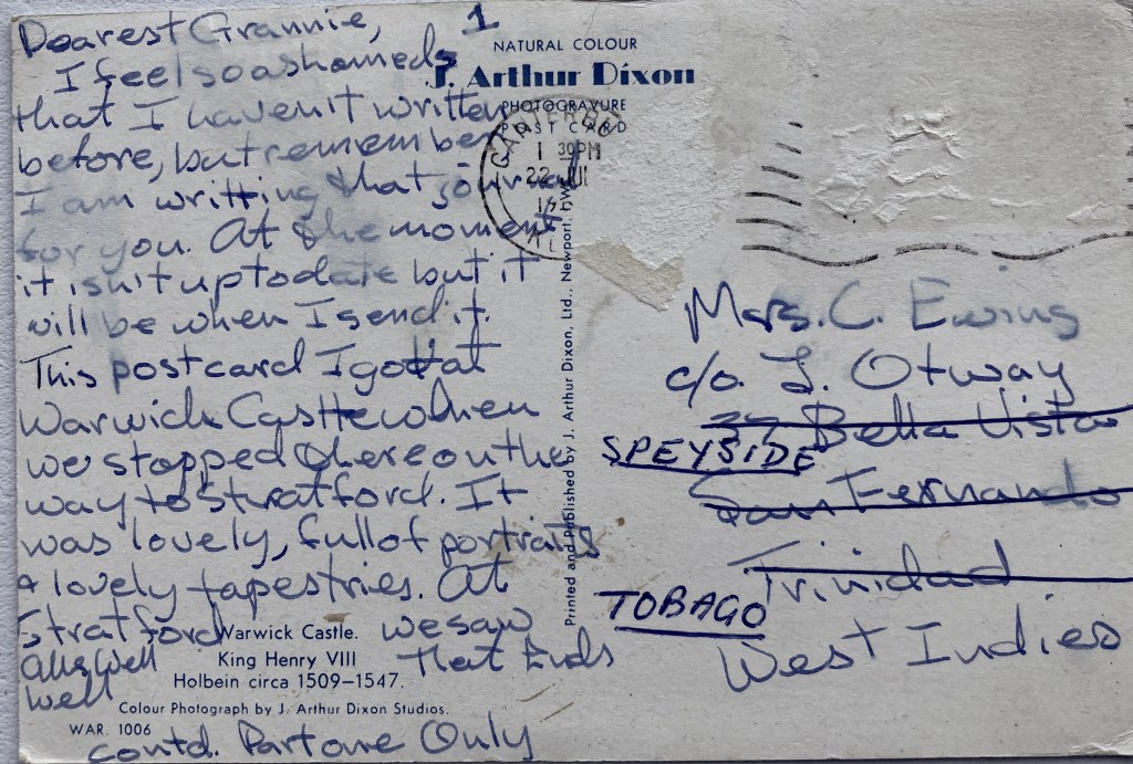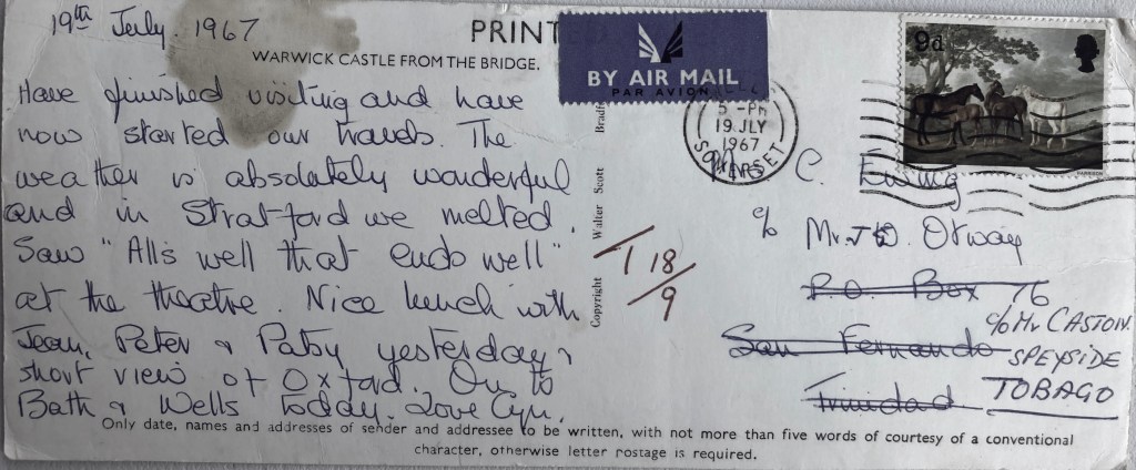 These are postcards from Cyn and Linda from the holiday in England, sent to Carol a week after Cyn’s letter to her mother. Carol seems to have been on holiday herself, visiting the Otway relatives in Trinidad and Tobago, and the cards were forwarded, with Linda’s second one trimmed so the top and bottom of the message is missing, and the stamps removed, which may account for the water damage that erased a few words.