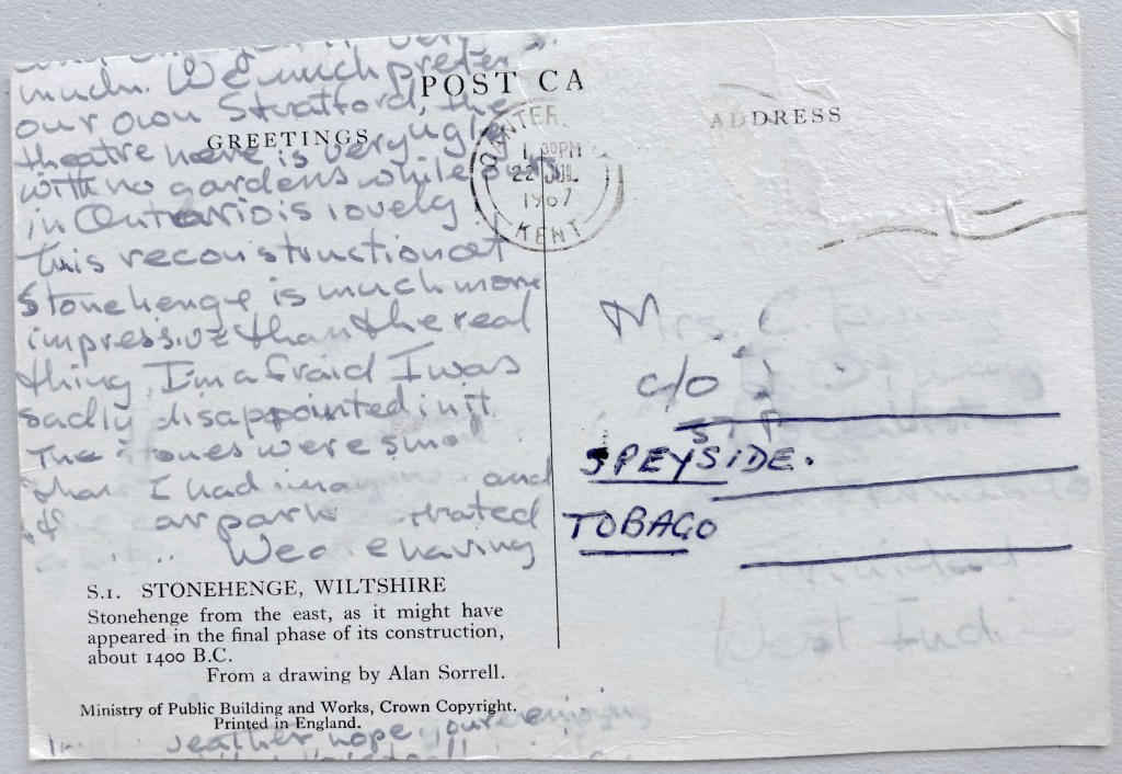 Presumably this one started with a #2 since it seems to have continued the discussion of Stratford, but the first and last lines are missing, and other words washed out. … much. We much prefer our own Stratford, the theatre here is very ugly with no gardens while ours in Ontario is lovely. This reconstruction of Stonehenge is much more impressive than the real thing, I’m afraid. I was sadly disappointed in it. The stones were smaller than I had imagined and the car park …. … . We are having lovely weather, hope you are enjoying…