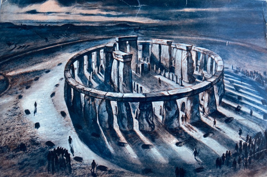 Colour postcard showing drawing of a re-creation of Stonehenge. Address washed out.