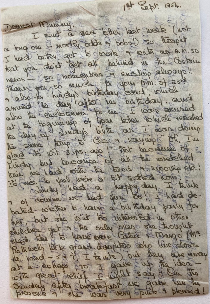 I am quite shocked and horrified at the wickedness of the Trinidad Post Office! Imagine not even trying the address on a letter but sending it on to an old address. I quite thought when your letter from me was sent back to England that somehow I must have got the wrong P.O. Box number, but when it was right after all, I was disgusted at them. I wonder how many of the letters and cards I sent were delivered to you, because I think I sent most of them to Bill’s address, particularly after you went to Tobago. As far as I remember I wrote 3 letters from England and sent various cards, and then I wrote at least twice in August before you went back to St. V. and after we returned to Ottawa. Anyway, for once it may not be just my irregular writing habits!