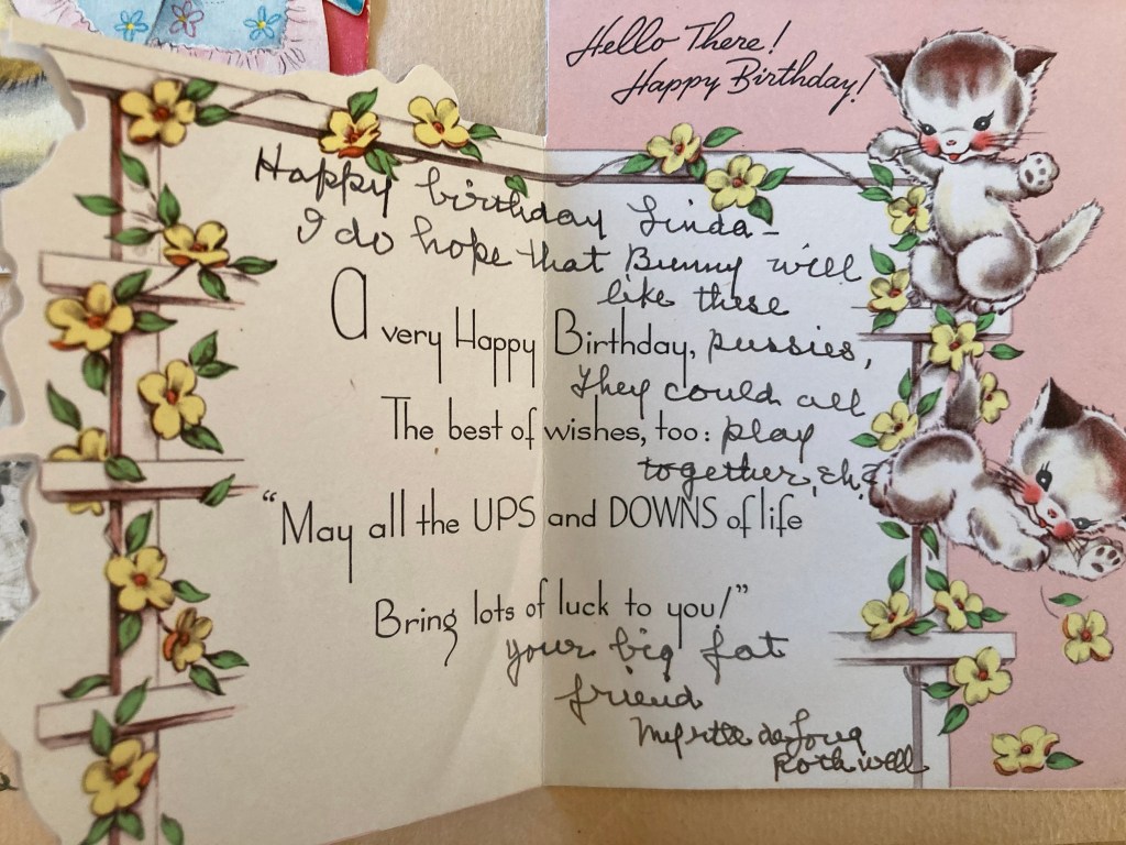 I have mentioned before when I started this project, that both my grandmother (who saved these letters), and my mother (who got them back when my grandmother brought them with her when she came to live with my parents), read, organized and enjoyed these letters years after they were written as they read them again in their old age- and how I am following in their footsteps! On the envelope of this long typed effusion Carol had written an identifier in pencil: ‘Cyn’s trip and what she thought of everyone’ and Cyn later wrote her own on the back: ‘England Visit 1967’. It must have been entertaining to write about her friends after meeting them for the first time in 18 years, and fun for Carol to read about them, and for each to re-read years later. However, at the end of the letter, Cyn asked her mother not to tell anyone about her opinions, or she wouldn’t have a friend left. I am now literally “spreading…[her] opinions to the winds” and hope that they will not offend anyone reading them today! She wrote this spread over a week while working at the newly opened Nursery School, and I am sad that the sequel she promises at the end does not exist- no more letters until April 1968 were preserved.