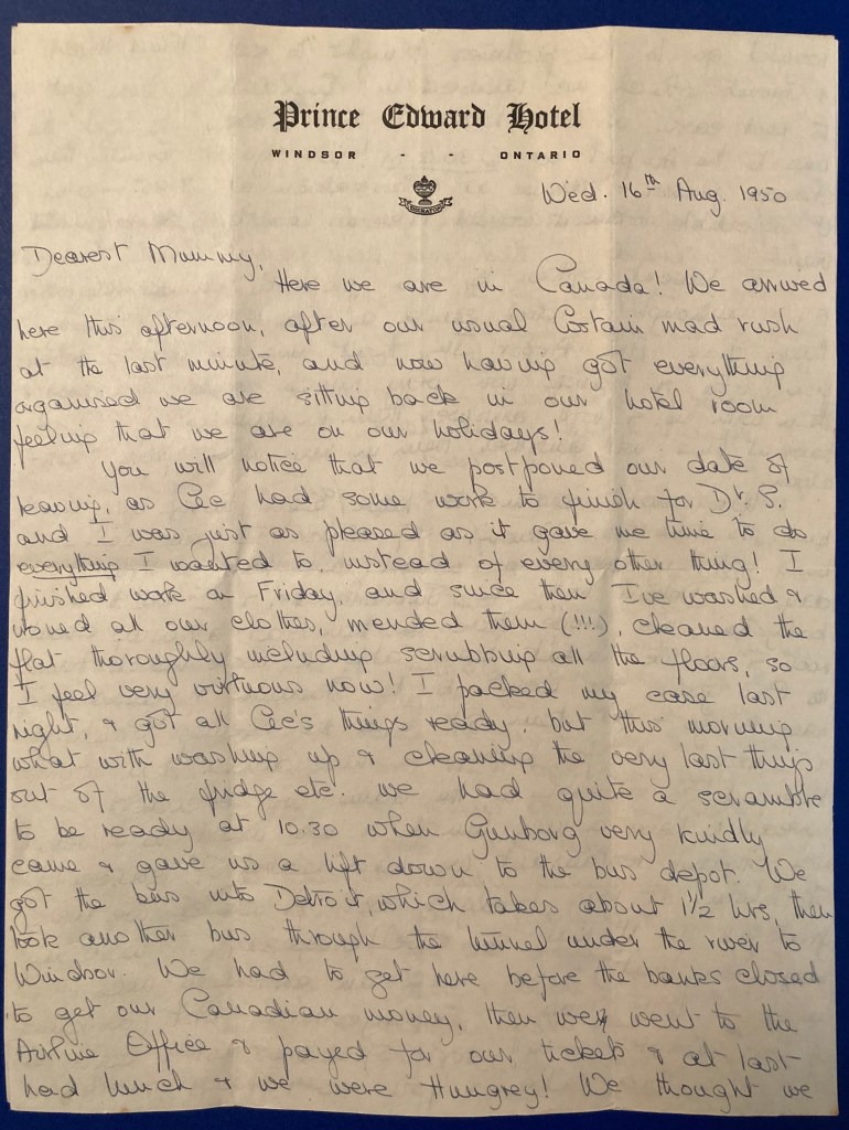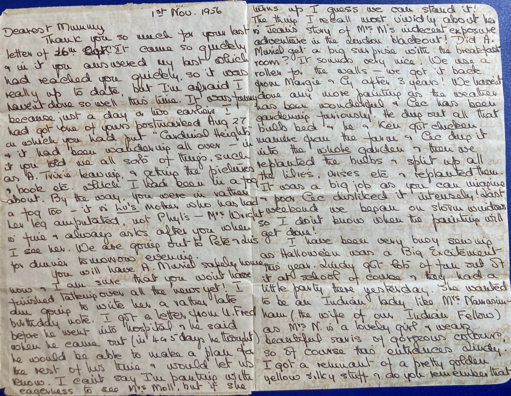 Thank you so much for your last letter of 26th Oct.! It came so quickly & in it you answered my last which had reached you quickly, so it was really up-to-date, but I’m afraid I haven’t done so well this time. It was funny because just a day or two earlier I had got one of yours postmarked August 27 on which you had put “Cardinal Heights” and it had been wandering all over – in it you told me all sorts of things, such as A.Trixie leaving, & getting the pictures & book etc. which I had been in a fog about. By the way, you were in rather a fog too- it is Lu’s mother who has had her leg amputated, not Phyl’s – Mrs. Wright is fine & always asks after you when I see her. We are going out to Pete & Lu’s for dinner tomorrow evening.
