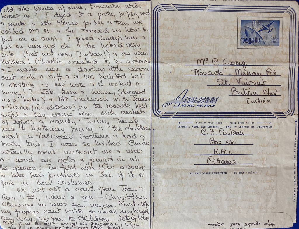 I have been very busy sewing as Halloween was a Big Excitement this year. Lindy got lots of fun out of it at school of course & they had a little party there yesterday. She wanted to be an Indian lady like Mrs. Narasimham (the wife of our Indian Fellow) as Mrs. N. is a lovely girl & wears beautiful saris of gorgeous colours, so of course this entrances Lindy. I got a remnant of a pretty golden yellow silky stuff & do you remember that old silk blouse of mine, brownish with horses on? I dyed it a pretty poppy red & made a little blouse for her & then we visited Mrs. N. & she showed me how to put on a sari. I fixed Lindy’s hair & put on earrings etc. & she looked very cute – (but not very Indian!) & she was thrilled! Charlie wanted to be a clown & I made him a darling little clown suit with a ruff & a big pointed hat & lipstick on his nose & he looked a honey! I took them & Jimmy (dressed as a lady) & Pat Tomlinson with Joanne & Susan (as witches) on the rounds last night & they came home with baskets of apples & candy! Today Janek had a birthday party & the children went in Halloween costume & had a lovely time. I was so thrilled – Charlie actually went without me & was as good as gold & joined in all the games! The first time! Cec is going to take their pictures on Sat. if it is fine in their costumes.