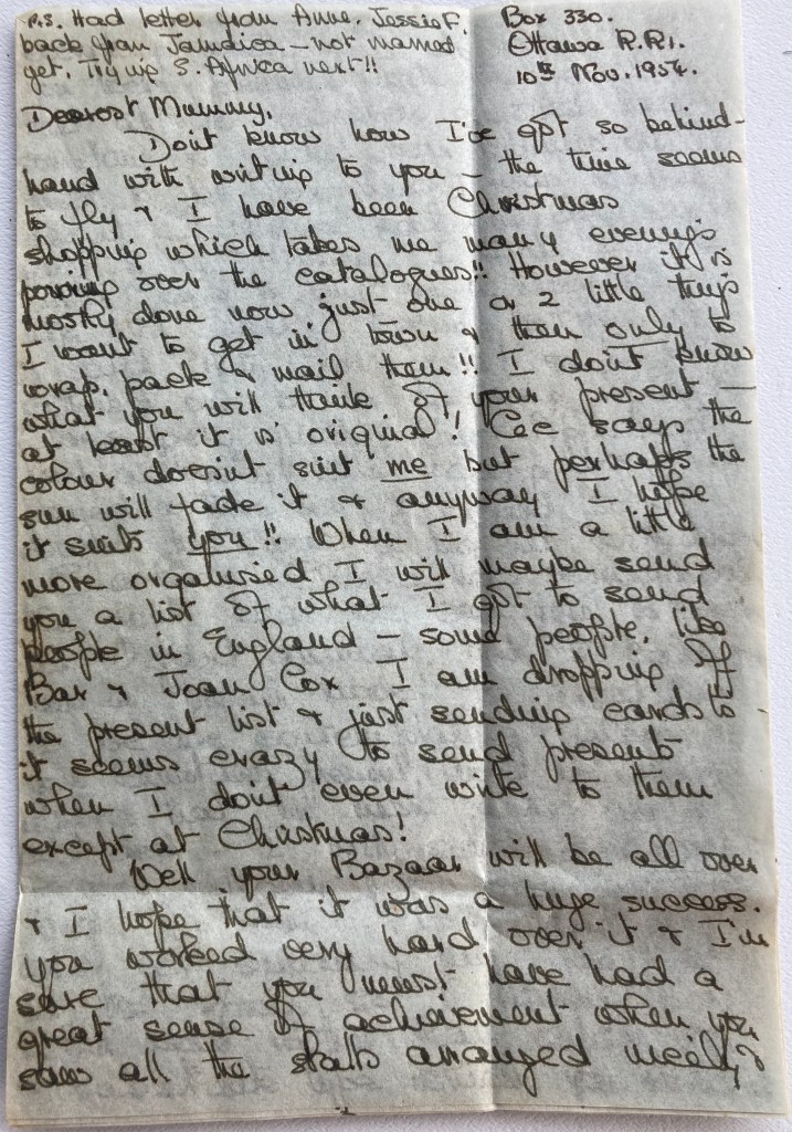 Dearest Mummy, Don’t know how I got so behind-hand with writing to you – the time seems to fly & I have been Christmas shopping which takes me many evenings poring over the catalogues!! However it is mostly done now, just one or 2 little things I want to get in town & then only to wrap, pack & mail them!! I don’t know what you will think of your present – at least it is original! Cec says the colour doesn’t suit me but perhaps the sun will fade it & anyway I hope it suits you!! When I am a little more organized I will maybe send you a list of what I got to send people in England – some people, like Bar & Joan Cox I am dropping off the present list & just sending cards to- it seems crazy to send presents when I don’t even write to them except at Christmas! Well your Bazaar will be all over & I hope that it was a huge success. You worked very hard over it & I am sure that you must have had a great sense of achievement when you saw all the stalls arranged nicely & everything ready & I do hope that you were pleased with the results & that all the children enjoyed having something to spend their pennies on! I forgot to tell you when I was writing about Christmas that one day Linda said to me “Mummy, I think I’d like Santa Claus to bring me a new dolly” & little old Charlie came trotting up & said “ ‘anta Claus, ‘orsie!” so he has cottoned on to the meaning of Santa Claus pretty quick! Carol Appleyard had a lovely little rocking horse that played a tune as it rocked, so of course this was a big hit with Linda & Charlie & Charlie has remembered! We don’t think we can rise to such an elegant animal, but the catalogue has a plainer model for about $6.00 so we are contemplating! Talking of your Christmas present, don’t be disappointed that the mesh panties aren’t included – I will send them maybe for your birthday if you can last that long! (Do like A. Moo!!) but you can’t get summer things like that till the spring, so I thought I’d better wait rather than send you a substitute type which you mightn’t like so well. Had I had my “Ladies Night” when I last wrote you? Anyway I know you I told you I was going to have it & it passed off very well. I like Mrs. Blachut, the Swiss lady very much. She is slim & tall & dark & quite vivacious – in her 30ies somewhere. Mr. Blachut is nice too, but very formally polite you know, in the Polish way, but she is very natural & easy to get to know. Her name is Fanny & we now call each by our 1st names & it always makes me want to giggle thinking of the expressions about “your Aunt Fanny”! He is another Tadek, but she calls him Teddy. Flora, the girl married to the Englishman is nice but a bit odd! Very thin & gawky with deepset dark eyes & a big beaky nose – about 24 to 26-ish I should think. She talks on in a vague way, but not having children she isn’t up in the general mothercraft chat! Elaine is the English woman & she seems nice too – she hates cooking & loves gardening – but of them all I like Fanny best. Shirley Aitken (Hughes) is nice too, but a bit aloof I feel – I don’t know if it’s her manner or if she really is! She looked quite tummy-ish the night she was here, so either her muscles have gone to pot or she’s that way again! We had June to dinner a few evenings later, & poor girl. I do feel sorry for her. George has the most impossible job & they never seem to be able to settle down to a decent normal life with him dashing about all the time. He is more or less transferred to Montreal now & after Christmas when June’s Fellowship with the Council ends they will be moving there. June hates the thought of it as she is just beginning to like Ottawa and of course Montreal is so French & much more city-ish. We have been seeing quite a bit of Betty & Al McNamara lately. I introduced Betty to the little butcher out at Orleans & last week I had the car so the children & I went over and had coffee with Betty & then we all drove out to the butchers – it makes quite a nice little trip & the children love the car. They both go in the back now & are quite grown-up & independent. Cec & I went over to Betty & Al’s on Friday evening for bridge & coffee & had quite a nice time, but golly! both Cec & I think Betty is getting more & more like her Mother all the time! We feel quite sorry for Al (probably he doesn’t mind at all!) as the parents are over at least once a week & they go to the Burroughs on Sat. or Sun. & Betty just seems to quote her Mother continually! What Mother says is introduced into every conversation & as you’ll have gathered we don’t think much of Mother’s opinions anyway! Father is such a nice interesting little man, but he never gets a “quote”!! Their house is quite nice – actually quite big – sitting room, kitchen & 2 other rooms down & bathroom & 2 bedrooms up, but they’re not using upstairs as they have no need to & no furniture anyway. It has been all re-painted which is nice & the heater in the sitting room isn’t obtrusive. They are allowed 1 year there ($40.00 a month rent) & then must move, but they should have saved a bit & got organized by then. The Big event last week was that Linda & Charlie were invited to their 1st Birthday Party! Fanny called up about Tues. & invited them to come on Sat. as Janek was 3, so you can imagine! I was a bit dubious about how they would get on without me, but in the end Fanny asked if I would come too as there were to be a few Mothers there & she asked if I’d help give them tea while she was busy with the children. So I was there too & I don’t know if it was a good thing or not! On the Friday we went shopping & got Janek a paint box & Lindy a pair of party shoes! She has always had just the little brown lace up ones, so I got her a pair of black kid with a strap & buckle & a crisscross on the toe.