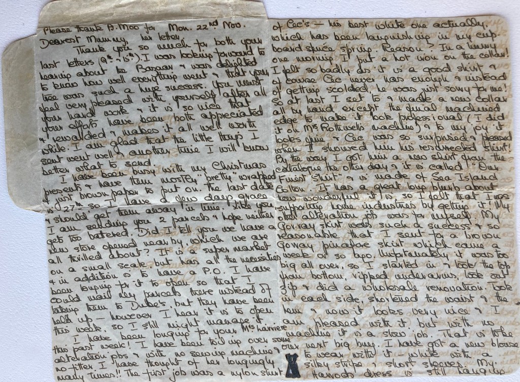 Dearest Mummy, Thank you so much for both your last letters (9th & 15th). I was looking forward to hearing about the Bazaar & was delighted to know how well everything went & that your tree was such a huge success. You must feel very pleased with yourself after all your hard work & it is so nice that your efforts have been both appreciated & rewarded & makes it all well worth while. I am glad that the little things I sent went well & another time I will know better what to send. I have been busy with my Christmas presents & have them mostly “pretty” wrapped & just brown paper to put on. The last date is 27th, so I have a few days grace & should get them away in time. Like you I am sending you 2 parcels & hope neither gets too battered. Did I tell you we have a new store opened nearby, which we are all thrilled about? It is a super market on a small scale, but has all the necessities & in addition is to have a P.O. I have been longing for it to open so that I could mail my parcels there instead of taking them to Dube’s, but they have been held up – however I hear it is to open this week, so I still might manage it. I have been longing for your Mrs. Larriere this past week! I have been toiling over some alteration jobs & with no sewing machine & no fitter, I have thought of her longingly many times!! The first job was a nylon shirt of Cec’s – his best white one actually, which has been languishing in my cupboard since spring. Reason? In a hurry one morning I put a hot iron on the collar! I felt so badly as it is a good shirt & of course Cec never has enough & instead of getting scolded, he was just sorry for me! So at last I set to & made a new collar all by hand except the final machined edge to make it look professional (I did it on Mrs. Rothwell’s machine) & to my joy it looks fine & Cec was so surprised & pleased when I showed him his resurrected shirt! By the way I got him a new shirt from the catalogue the other day & it is called “Our Finest Shirt” & is made of Sea Island Cotton. It has a great long blurb about how wonderful it is, so I felt that I was supporting home industries by getting it! My other alteration job was for myself. My Gor-ray skirt was such a success & so reasonable that I sent for a brown Gorray pinafore skirt which came a week or so ago. Unfortunately it was too big all over, so I started in & took the top from bottom, ripped underarms, took out the zip & did a wholesale renovation. Took in each side, shortened the waist & the hem & now it looks very nice & I am pleased with it, but with no machine it is a slow job. That is to be our next big buy. I have got a new blouse to wear with it – white with a silky stripe & short sleeves.