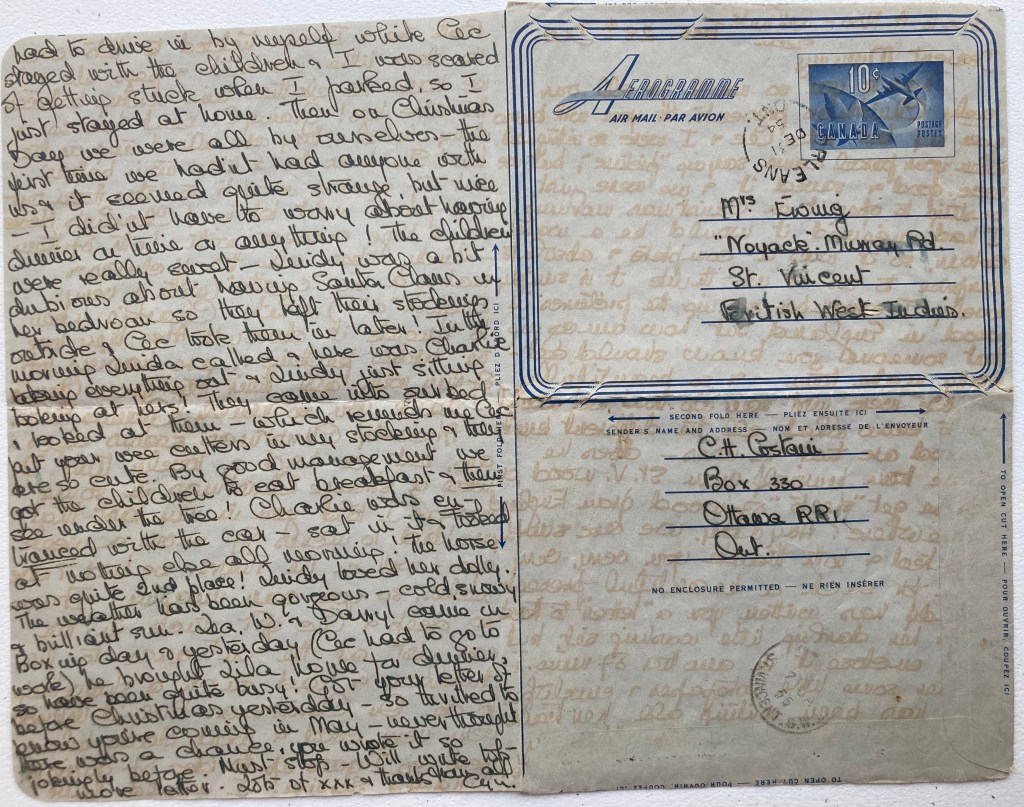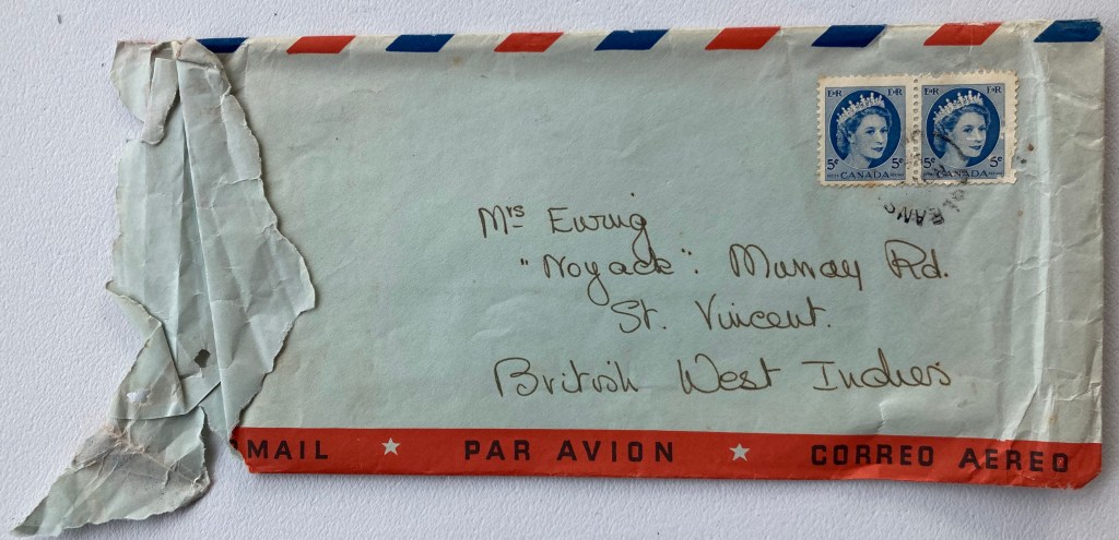 In this letter, we finally hear something about this Bazaar that my grandmother has been preparing for! Both Carol and her sister Muriel (A.Moo) were very involved with the affairs of the church in St Vincent, not only attending services, but doing the flowers for the services, and helping enthusiastically with fundraisers such as the Bazaar. (Cyn will follow their example in the community she has now moved to, but needs to join in creating an Anglican Church in their area first!) All ages must be catered for, so besides Baking Stalls, Jams and Pickles, White Elephant, Handicrafts and Clothing, and, best of all, the Afternoon Tea, it seems that Carol’s task for the Bazaar was setting up some sort of Lucky Dip where children got a mystery prize for their pennies. Cyn’s little cars and doll’s bottles were probably wrapped in pink or blue paper and carefully handed out to the correct gender, or perhaps picked off a tree by the child in person while their mother shopped. A note of explanation about Sea Island Cotton- this was an export of St. Vincent’s that Carol’s father, J.G.W. Hazell, had started in the 19th century and it was obviously considered a high-end product!