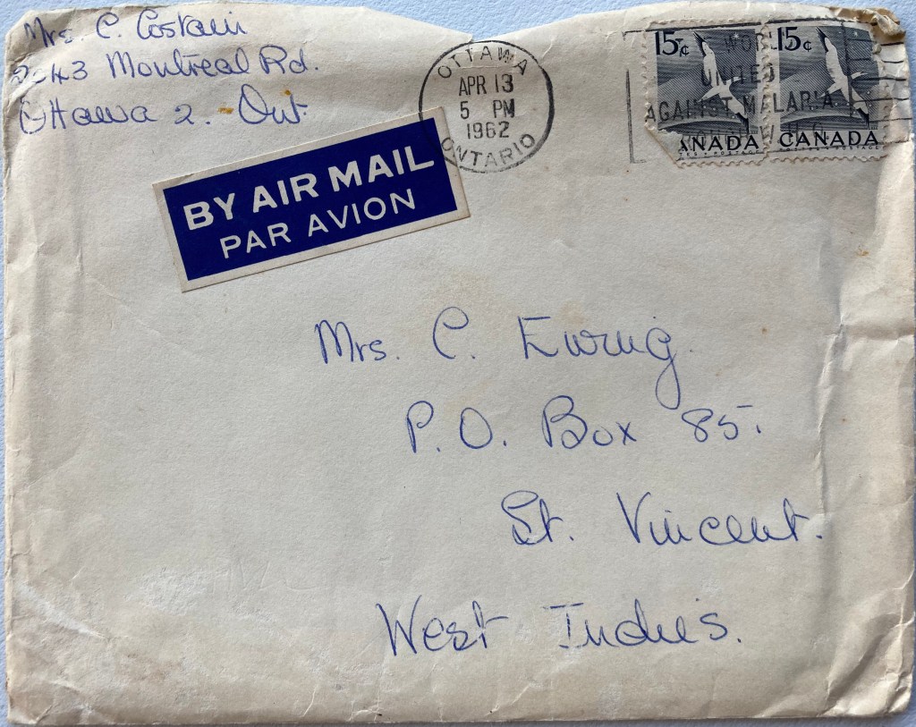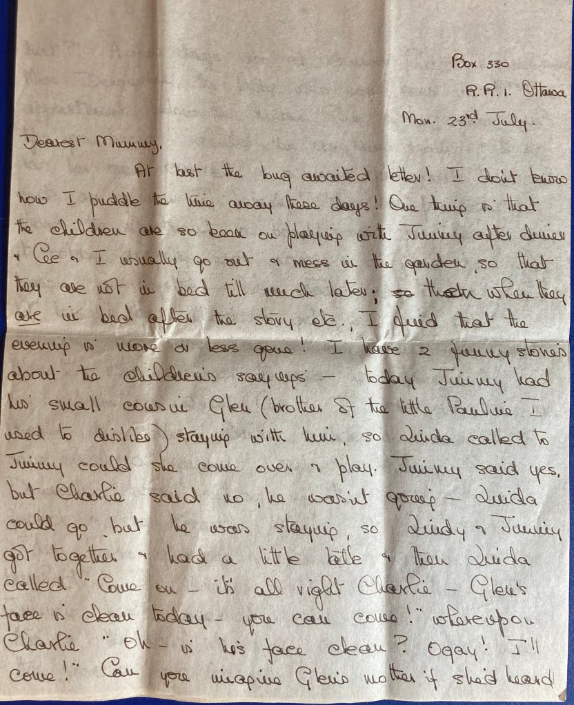Dearest Mama, Just a short note to answer some of your questions. You asked about my ribs etc. – they are fine now & I don’t feel any effects at all. When I am tired I get a bit of an ache in my back where the worst ones were & it is a little flat there, but it isn’t much & a rest puts it right again. As you can tell by all the wall-washing & painting etc. I am not incapacitated at all! You asked me about taking Charlie with his toe to the Hospital – yes, it was the one on Montreal Rd. – St. Louis-Marie de Montfort! It was just the Outpatient Department we went to, & we quite saw Life! – a father with 2 little children who had swallowed aspirins & had their stomachs pumped out! It seemed all right but all French of course & none of the Drs. seem to send anything serious there – the Civic has all the equipment & facilities I suppose. What do you think? Eve Proudfoot has a DAUGHTER! Born on the 11th, over 8 lbs. & called Laura Jane! You can imagine Mrs. Barltrop [the grandmother] – she is just popping!! She took us quite by surprise as Dr. Smith had said the end of the month but everyone is very pleased for her and Jim. Mr. & Mrs. B. have moved to a house in town, as they really needed the room I suppose. [The Proudfoots had 2 sons quite a bit older] There seems to be quite a spate of “second-thought” babies – when is Peggy’s due? Poor Pat Tomlinson is having another in August – Jamie is just 1 yr. now & she has so much trouble with varicose veins that I am really sorry for her. We have heard no more from our Insurance man & actually I feel I’d like to forget the whole thing now. We got about $150 rebate on our Income Tax & Ontario Medical Insurance as our Medical Expenses were so high last year – all my accident & Charlie’s business & Linda’s teeth – it was very welcome! L’s teeth are coming along fine- she has what she calls “metal work” all around her lower front teeth now, pulling them into shape & filling up the 2 spaces [I had had 4 teeth removed to make room] & she seems to get used to it quite quickly. Must stop now & get some work done. Hugs from the children – it is marbles & skipping season now! Love to Auntie Muriel – hello to Doris – With lots of love from Cyn.