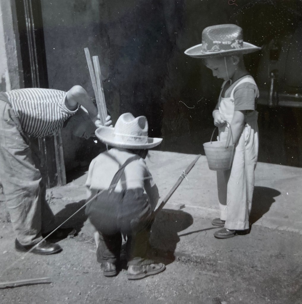 I am wearing them now – this morning Margie came in her car with the baby & Peter & collected me & the children & we went to Doreen Moore’s for coffee. Margie had lent (through me) Doreen a couple of her maternity dresses, so Doreen was returning them & we had a nice chat & saw the babies. Janey is a big baby & very sweet & fat & full of smiles. Little Paul is still a wee fellow & slept most of the time we were there. By the way, Cy is in Mexico for a week & Tommy & Danny are out in Sask. staying with Margie’s parents – Cy’s parents took them & will bring them back – so Margie is feeling very footloose.