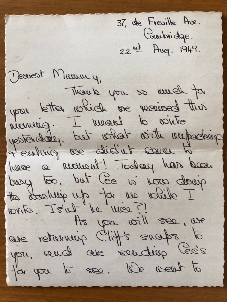 Thank you so much for your letter which we received this morning. I meant to write yesterday, but what with unpacking & eating we didn’t seem to have a moment! Today has been busy too, but Cec is now doing the washing up for me while I write. Isn’t he nice?!