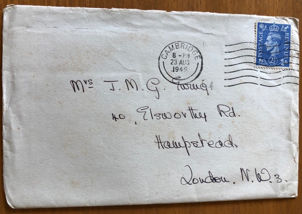 Cyn had close friends to keep in touch with, as well as her mother, and she was so fortunate that Dottie, Nan, Anne and others wrote to tell her about what was going on in their lives and to gossip about what was happening with friends and acquaintances. In her letters to her mother she mentions Joan Cox’s wedding and hopes that she will hear about it soon. The letter telling her survived and is presented here, showing quite a different voice and tone! Anne Winnick was a colleague from Coleridge in Cambridge where Cyn had taught, and since she was still teaching, caught her up with all the gossip from the school as well as the details of the wedding. And she finishes with a personal bombshell, probably why the letter was kept. Anne had married Tadek, who had come to England as a Polish soldier during the war, but has now become a British citizen and got his degree. Joan Cox’s sister also seems to have married a Pole, and they are the hosts at the wedding, with their son as the entertainment, apparently.