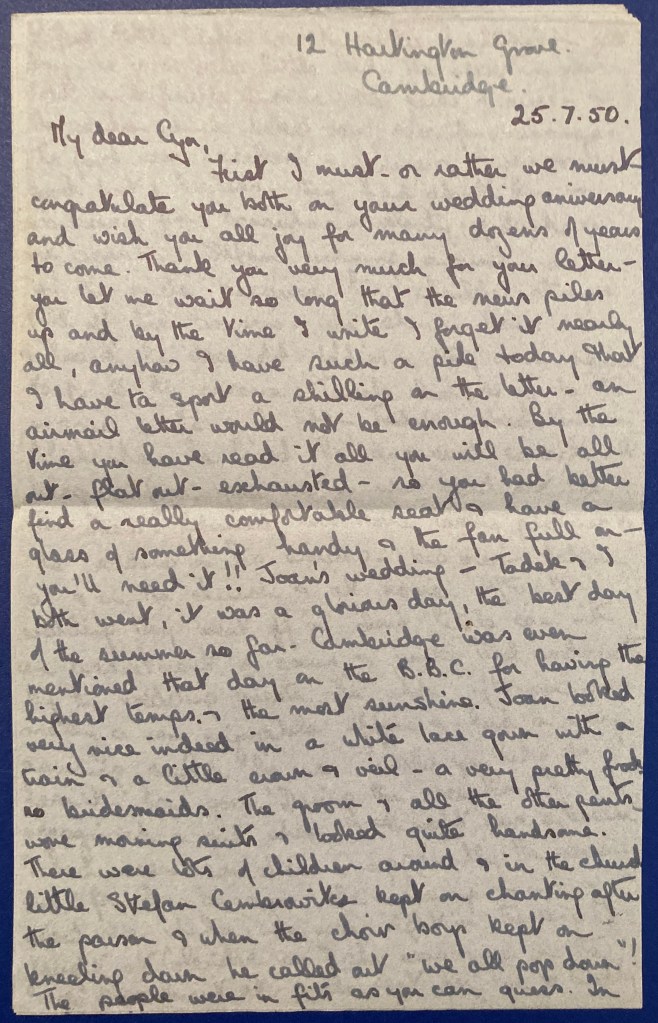First I must – or rather we must congratulate you both on your wedding anniversary and wish you all joy for many dozens of years to come. Thank you very much for your letter – you let me wait so long that the news piles up and by the time I write I forget it nearly all, anyhow I have such a pile today that I have to spend a shilling on the letter – an email letter would not be enough. By the time you have read it all you will be all out- flat out-exhausted – so you had better find a really comfortable seat & have a glass of something handy & a fan full on- you’ll need it!! Joan’s wedding- Tadek & I both went, it was a glorious day, the best day of the summer so far. Cambridge was even mentioned that day on the B.B.C. for having the highest temps. & the most sunshine. Joan looked very nice indeed in a white lace gown with a train & a little crown & veil – a very pretty frock, no bridesmaids. The groom & all the other gents wore morning suits & looked quite handsome. There were lots of children around and in the church little Stefan Cembrowicz kept on chanting after the parson & when the choir boys kept on kneeling down he called out “we all pop down”! The people were in fits as you can guess. In fact little Stefan was the centre of attraction all day – he is a cute little kid. The reception was held in De Freville Avenue- the house of course – & the garden which looked very nice for a change. The food was excellent & Jerome & Gwen made a good host & hostess- they had about four waitresses from somewhere – plenty of drinks & ice creams- & Stefan running around – once in the nude because his shoulder straps fell off his trousers – you should have seen & heard the dear old ladies – they were afraid to go to the rescue- Tadek had to go to the rescue in the end. When Tadek asked him in Polish where he lived he answered correctly. A telegram from your mother was read out with the others. Edward has some lovely pictures of the wedding in his window-big ones- taken at & in the church & at home. After the wedding they went off in Don’s little car with an assortment of cans & junk tied underneath by the wedding guests. The whole afternoon was really a very enjoyable affair & had a very amusing sequel for me – would you like to hear it – here goes. During the reception I recognized a girl who I thought was a teacher I had seen somewhere & apparently the same went for her because she came up to me & asked me whether she was right in thinking I taught at Coleridge as she was once on the Boys Department etc. & she sent her love to Waddy & Kay Harper. She had come up for the occasion especially from Surrey or Sussex. I gave the message to Waddy but forgot her name it was so funny- Bridie Elmper [?]. After describing her Waddy guessed it & said – “whatever is she doing here – she lives with her husband in Surrey & has no relatives here – the only person she knows lives in Royston where she taught once & on whom she was crazy in spite of being married to a fellow in the army – Don Humphris!!” “Well – that was the fellow who got married” said I- “Good Lord”– said Waddy “he ran around with Bridie even came to Coleridge to take her out when she came here & then met Kay Norman & took her about & the two women had a dreadful row over him & in the end he married someone else who was killed last year by lightning on the Royston golf course”! All this was news to me & I gasped as you can guess especially when Waddy said lots of women were crazy on Don- she apparently even went with the party to a pub now and then because she was very fond of this Bridie. Fancy Bridie coming up to the wedding & tagging her husband along too!! Did you know Don was a widower- do you remember that woman getting killed last year summer- I do. It certainly seemed funny that Waddy should give me the lowdown on this romance. Well so much for Joan.