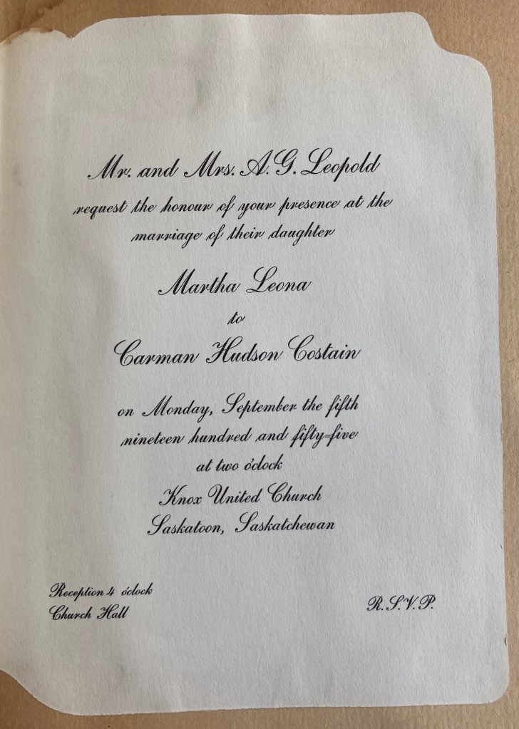 A reminder note about the family members mentioned in the letters of 1956. The previous letter referred to Lee, Wendell and Daryl Atchison. Lena was Cec’s second sister, older than he, and trained as a nurse. When Cyn first met them in 1948, they were living in a manse in small town Ontario, Wendell was the minister, and Lee worked as a nurse. Daryl is now 5, and after some family- and money- troubles, with Wendell being a salesman, he seems to have a new charge: they are now living in Carp, a village near Ottawa, and Lee is expecting a baby. Cyn’s father had been hospitalized in Newcastle after his separation from Carol a couple of years before Cyn’s marriage, and remains in an institution. Carol and Cyn had lived in Cambridge where Cyn taught, and where Cec met her while getting his PhD. Now his youngest brother, Carman, who seems to be as brilliant as Cec, has also won a scholarship to Cambridge, (although in a slightly different field, radio astronomy) and has married Leona. The 23 year-old newly-weds are experiencing life in England, and had enjoyed a visit from Pete Forsyth, a friend of the Costains from Saskatoon, with whom Carman had worked the summer he lived with Cec and Cyn in Ottawa.
