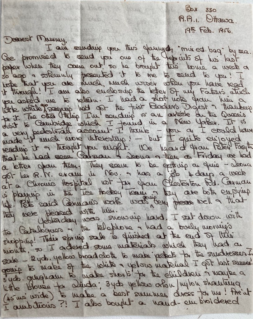 Box 330 R.R.1 Ottawa 19th Feb. 1956 Dearest Mummy, I am sending you this funny “mixed bag” by sea. Cec promised to send you one of the re-prints of his last paper when they came out, so he brought this home a week or so ago & solemnly presented it to me to send to you! I hope that you are much, much wiser when you have read it through! I am also enclosing the letter of my Father’s which you asked me to return. I had a short note from him a little while ago saying he’d got the first Reader’s Digest & thanking for it. The other thing I’m sending is an article on the Queen’s visit to Cambridge which I found in a New Yorker. It is a very pedestrian account I think – you or I could have made it much more interesting! – but I quite enjoyed reading it & thought you might.