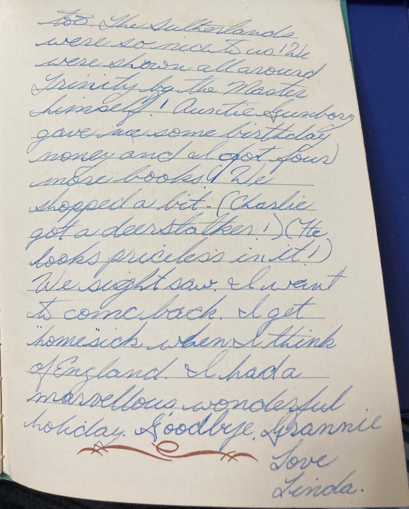 Auntie Gunborg gave me some birthday money and I got four more books. We shopped a bit- (Charlie got a deerstalker!) (He looks priceless in it!) We sightsaw, I want to come back. I get “home”sick when I think of England. I had a marvelous, wonderful holiday. Goodbye, Grannie Love Linda.
