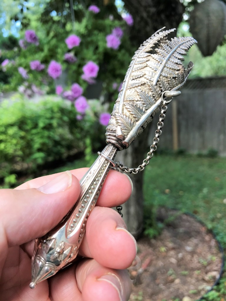 Silver bouquet holder: pin through leaves to hold the posy in even if upside down- you put your finger through the ring and let it dangle when dancing!