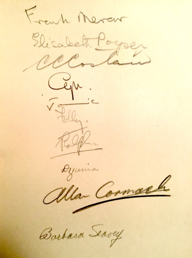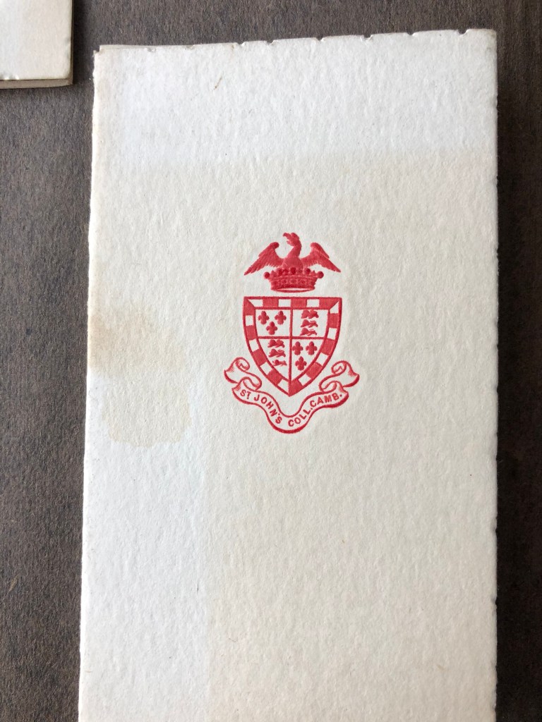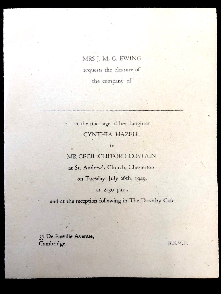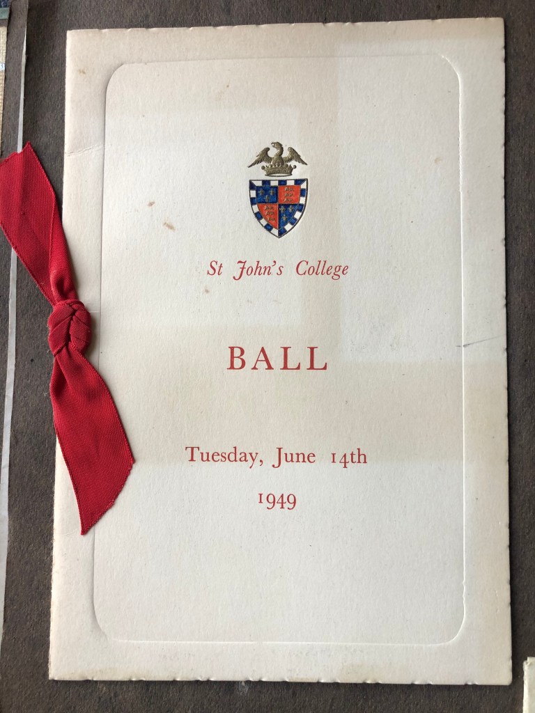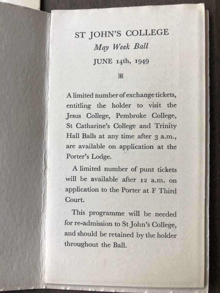 In the world of 2020, Cambridge’s May Balls were cancelled this June because of the Covid 19 pandemic. But in 1949, Cyn and Cec went to the May Ball at St. John’s College, and although I can’t help wondering how much dancing Cyn got to do because I never knew Cec to dance, I am sure they had a wonderful night: a party of 10, white tie, ball gowns, dance cards, a menu that assumed it was an all-night affair (and which of course Cyn saved), and an atmosphere of general rejoicing at the end of the academic year.